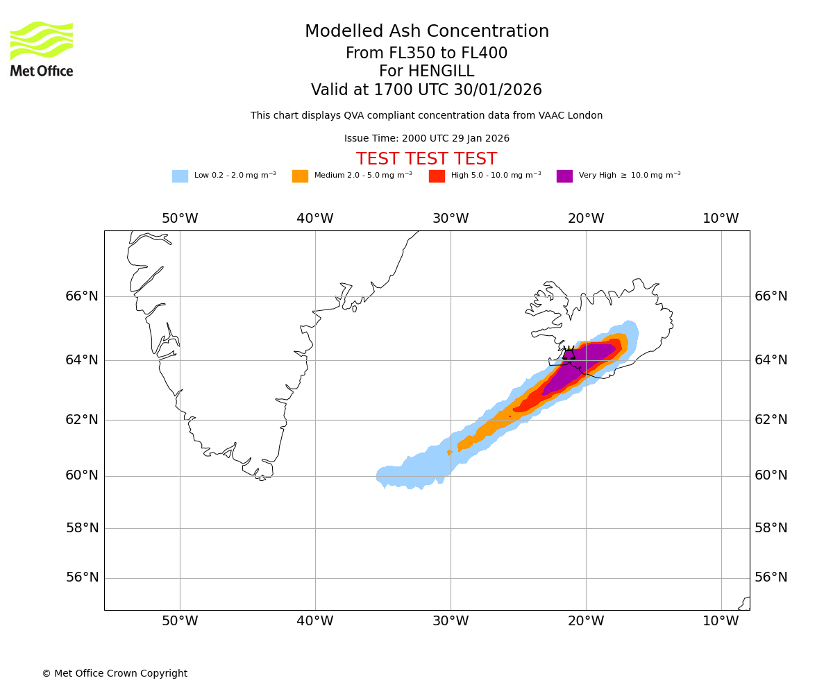 Modelled ash concentration from 350 to 400 for HENGILL. Valid at 1400 UTC 30/01/2026