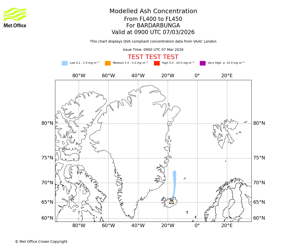 Modelled ash concentration from 350 to 400 for BARDARBUNGA. Valid at 0900 UTC 07/03/2026