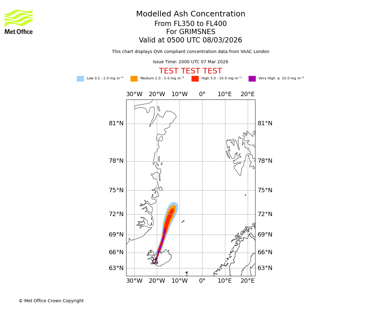 Modelled ash concentration from 350 to 400 for GRIMSNES. Valid at 0200 UTC 08/03/2026