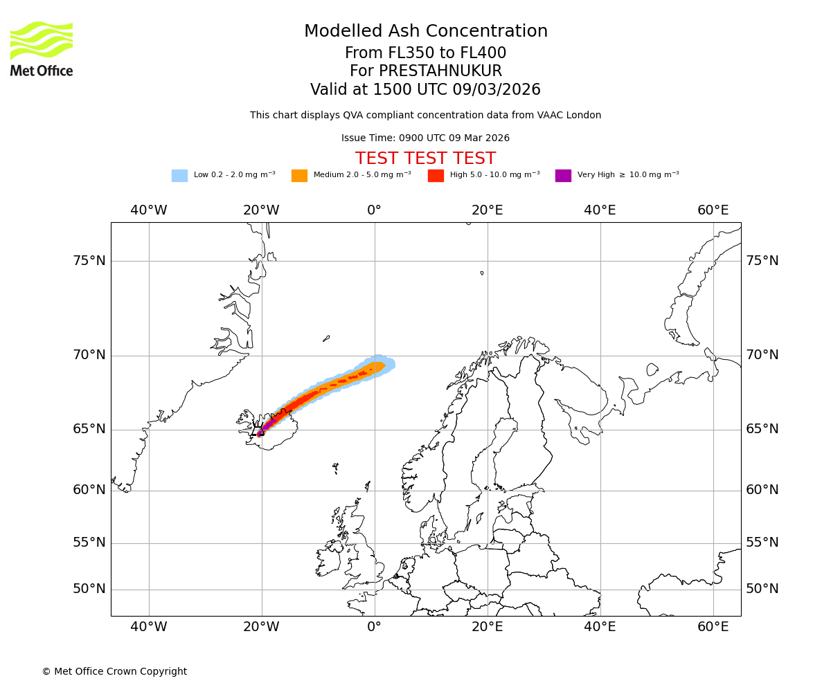 Modelled ash concentration from 350 to 400 for PRESTAHNUKUR. Valid at 1200 UTC 09/03/2026