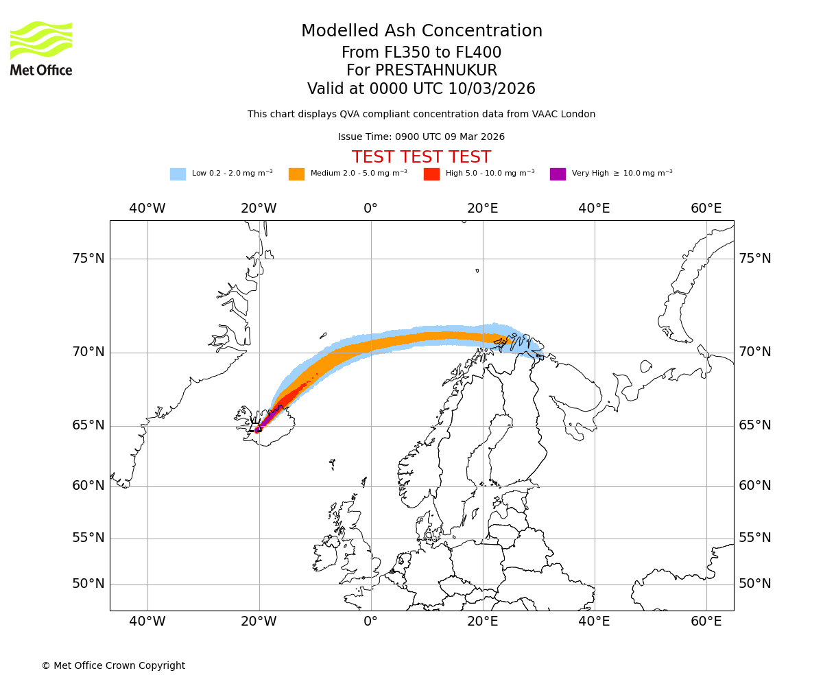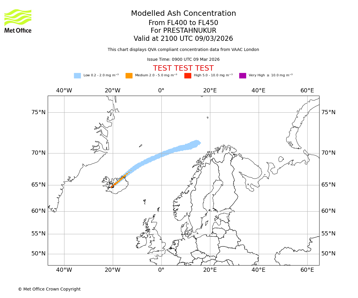 Modelled ash concentration from 350 to 400 for PRESTAHNUKUR. Valid at 2100 UTC 09/03/2026