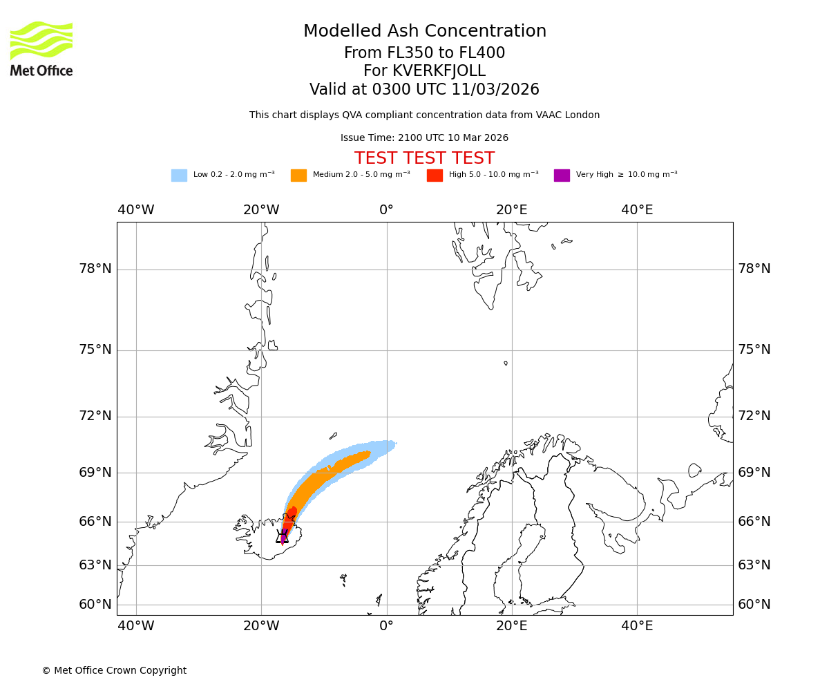 Modelled ash concentration from 350 to 400 for KVERKFJOLL. Valid at 0000 UTC 11/03/2026