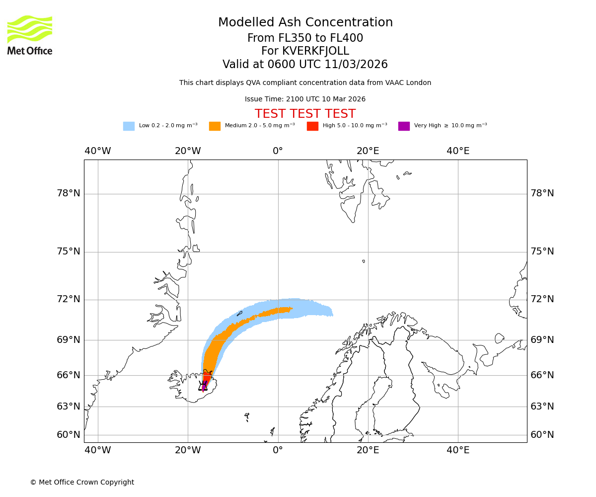 Modelled ash concentration from 350 to 400 for KVERKFJOLL. Valid at 0300 UTC 11/03/2026
