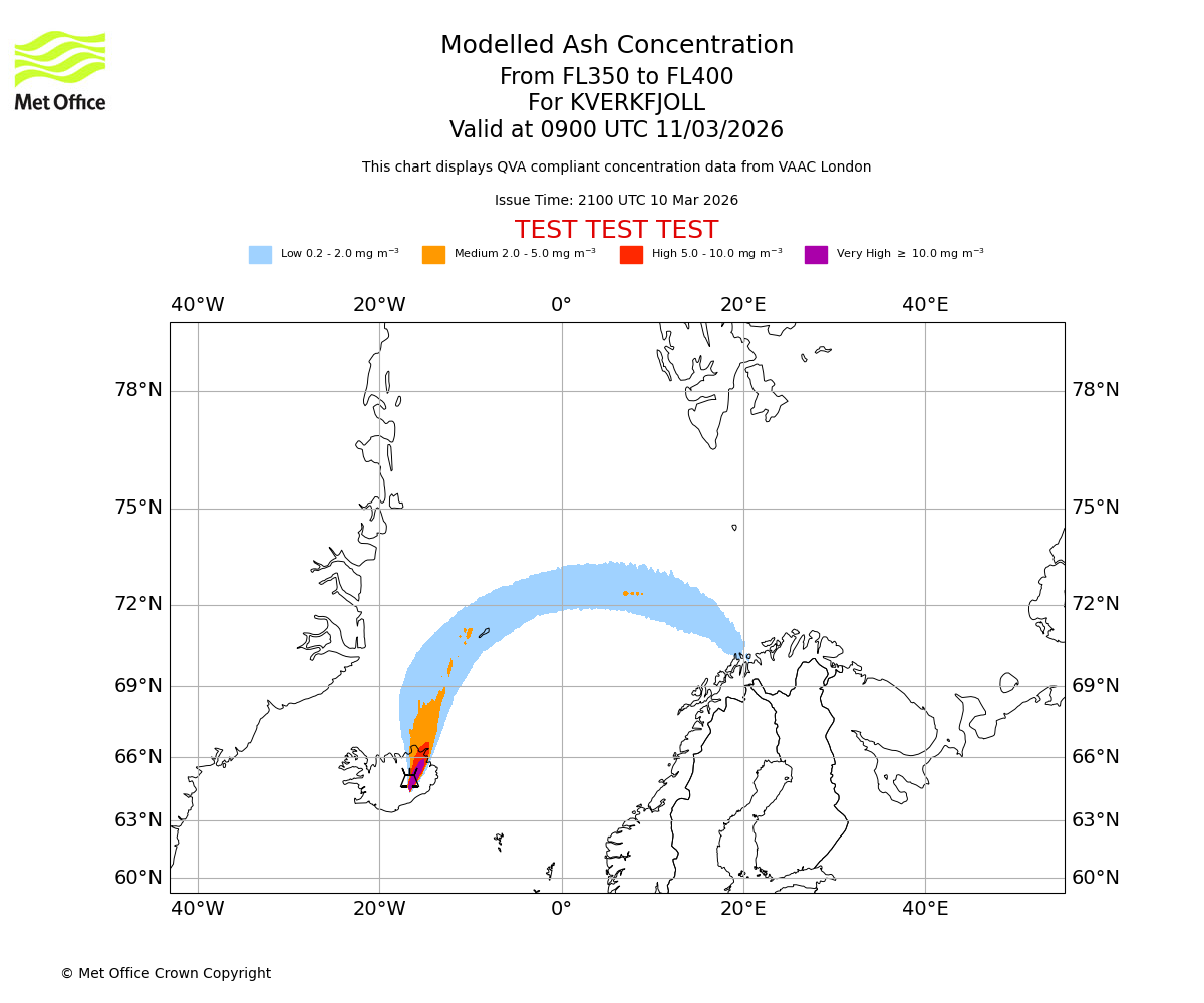 Modelled ash concentration from 350 to 400 for KVERKFJOLL. Valid at 0600 UTC 11/03/2026
