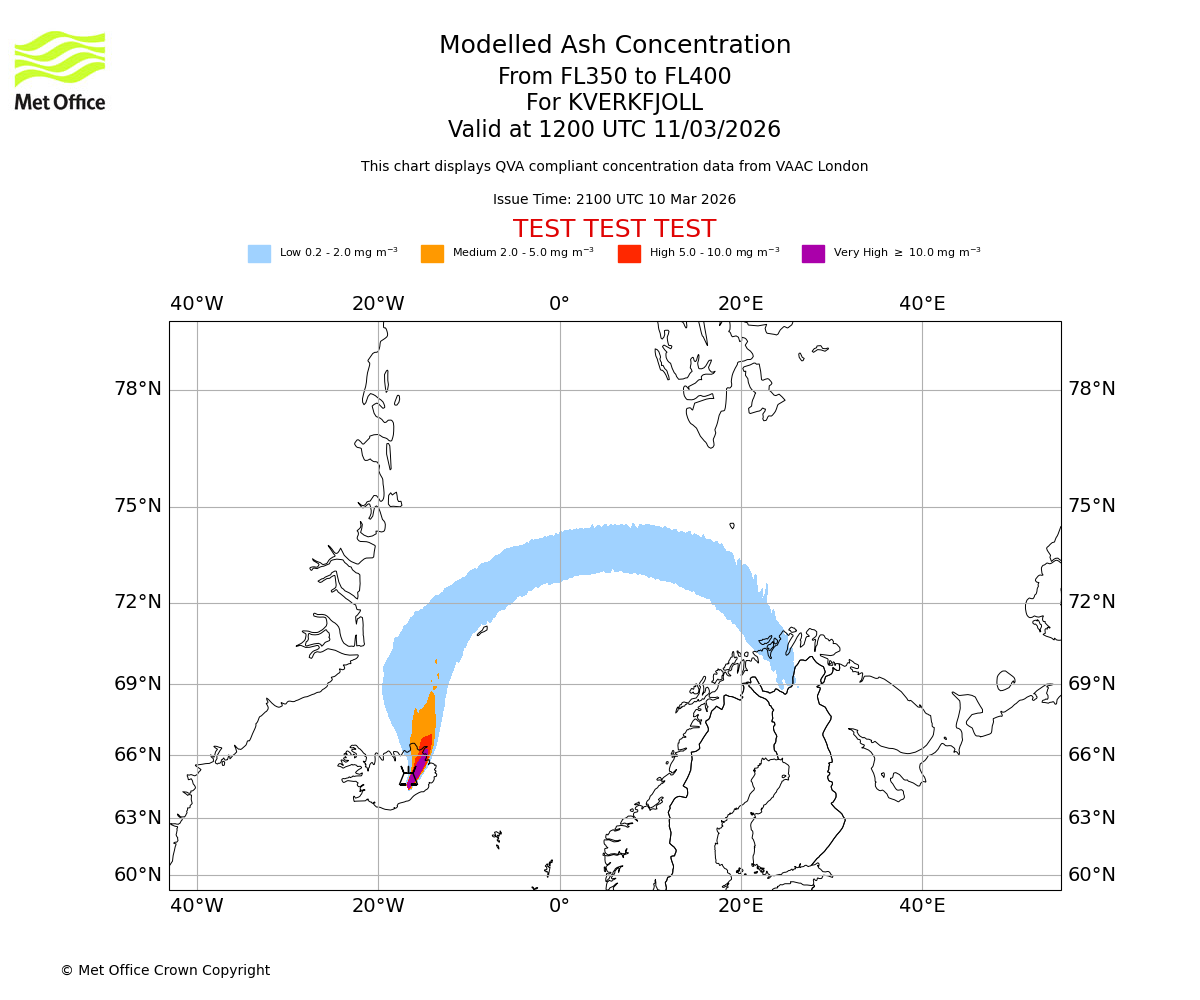 Modelled ash concentration from 350 to 400 for KVERKFJOLL. Valid at 0900 UTC 11/03/2026