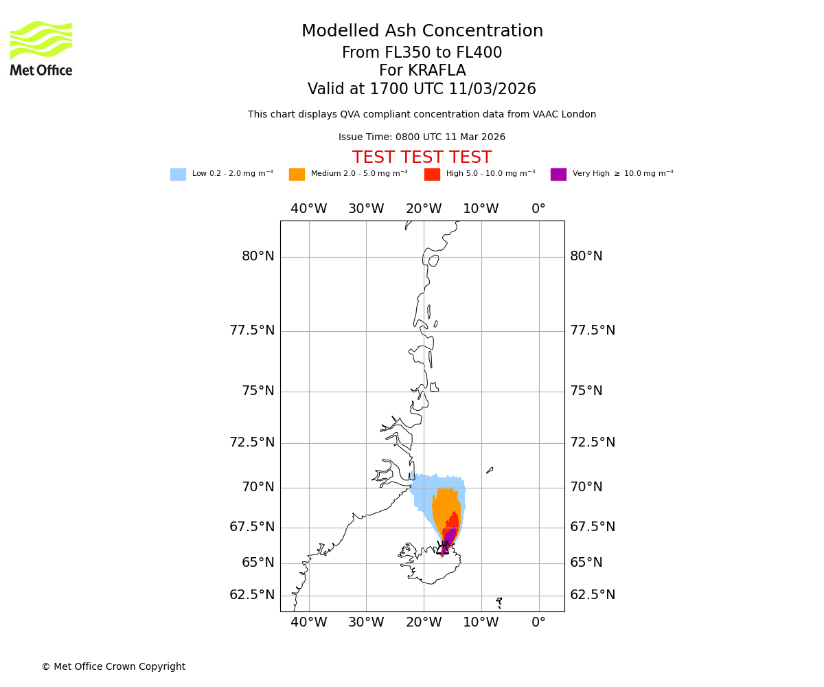 Modelled ash concentration from 350 to 400 for KRAFLA. Valid at 1400 UTC 11/03/2026