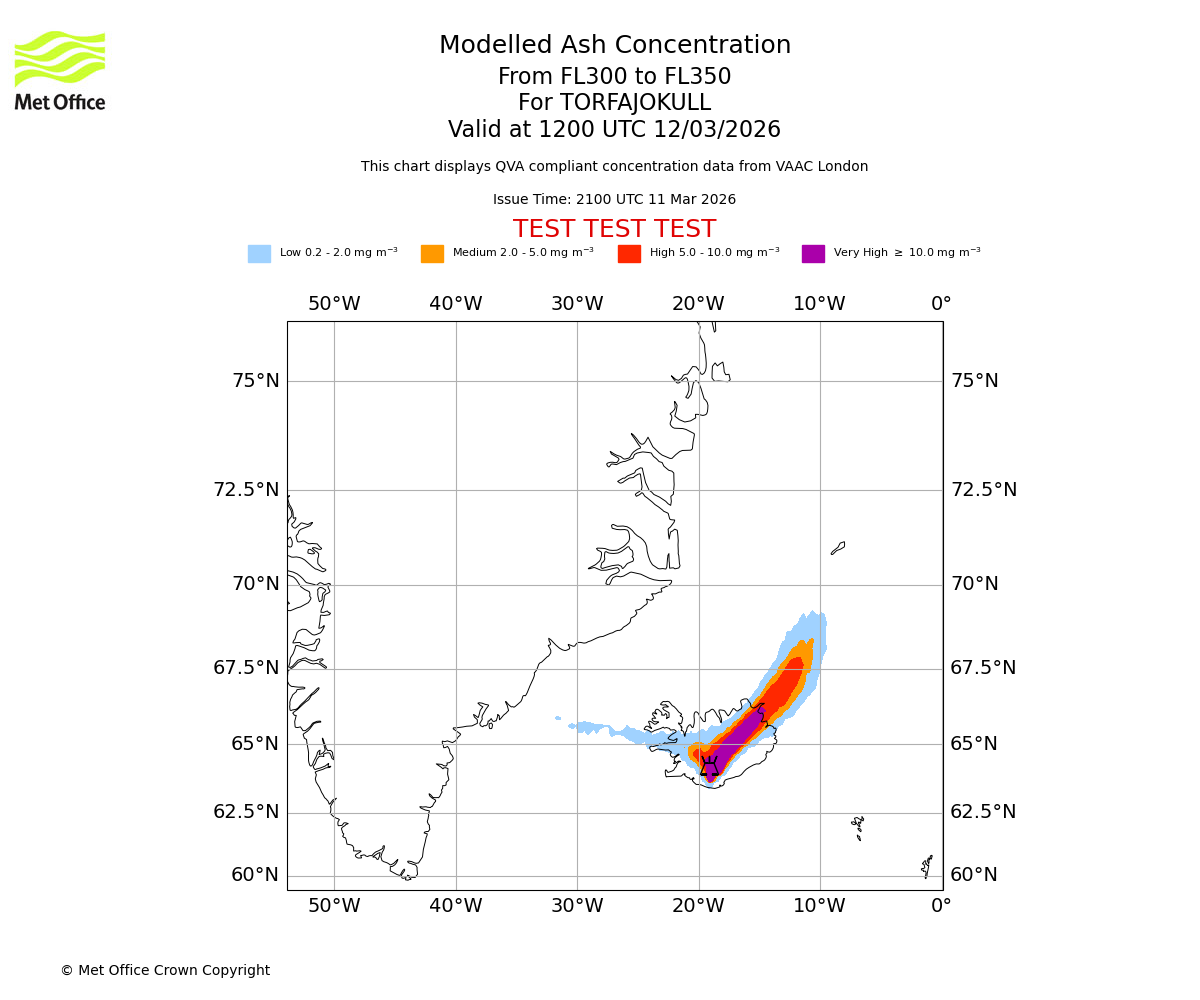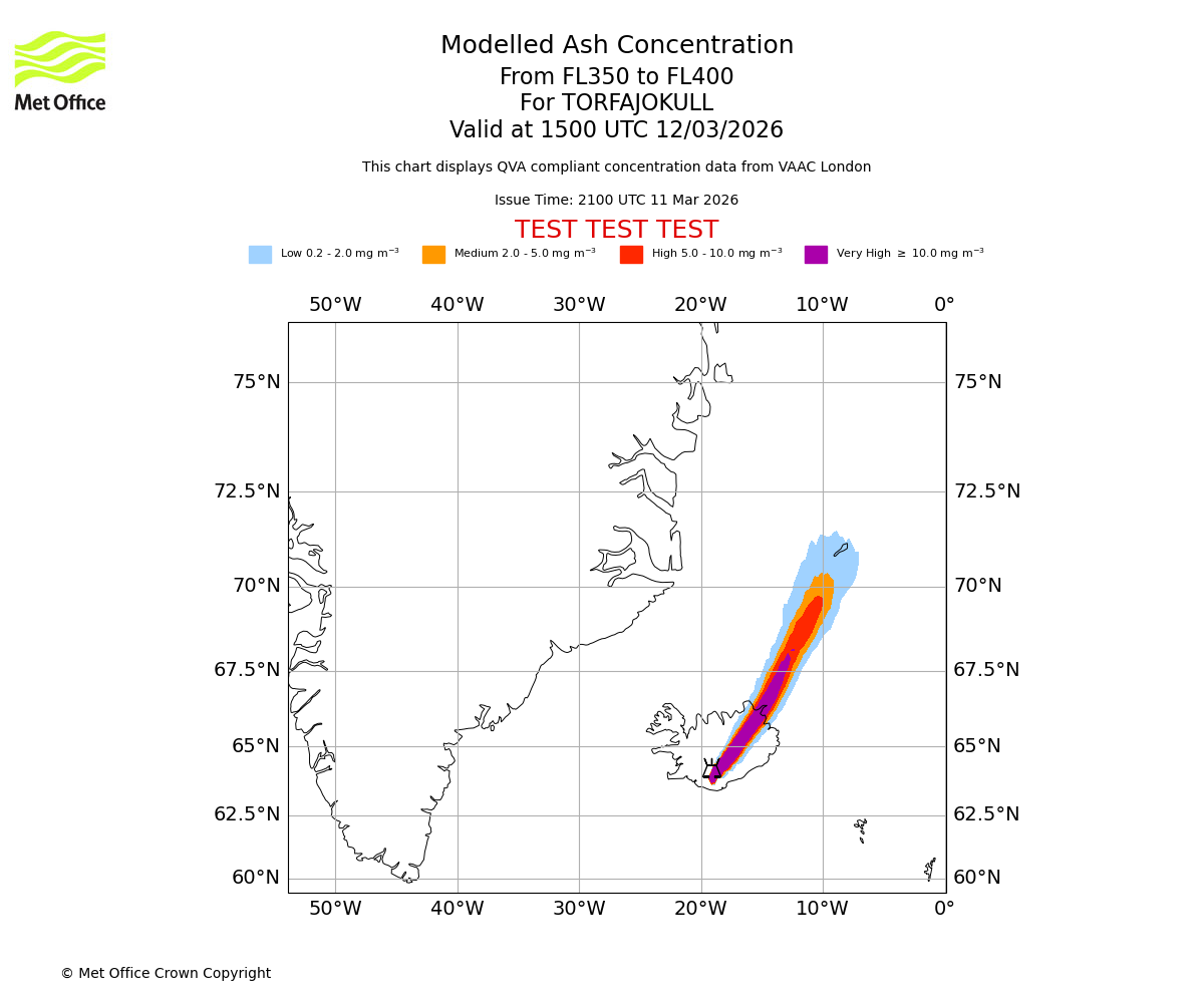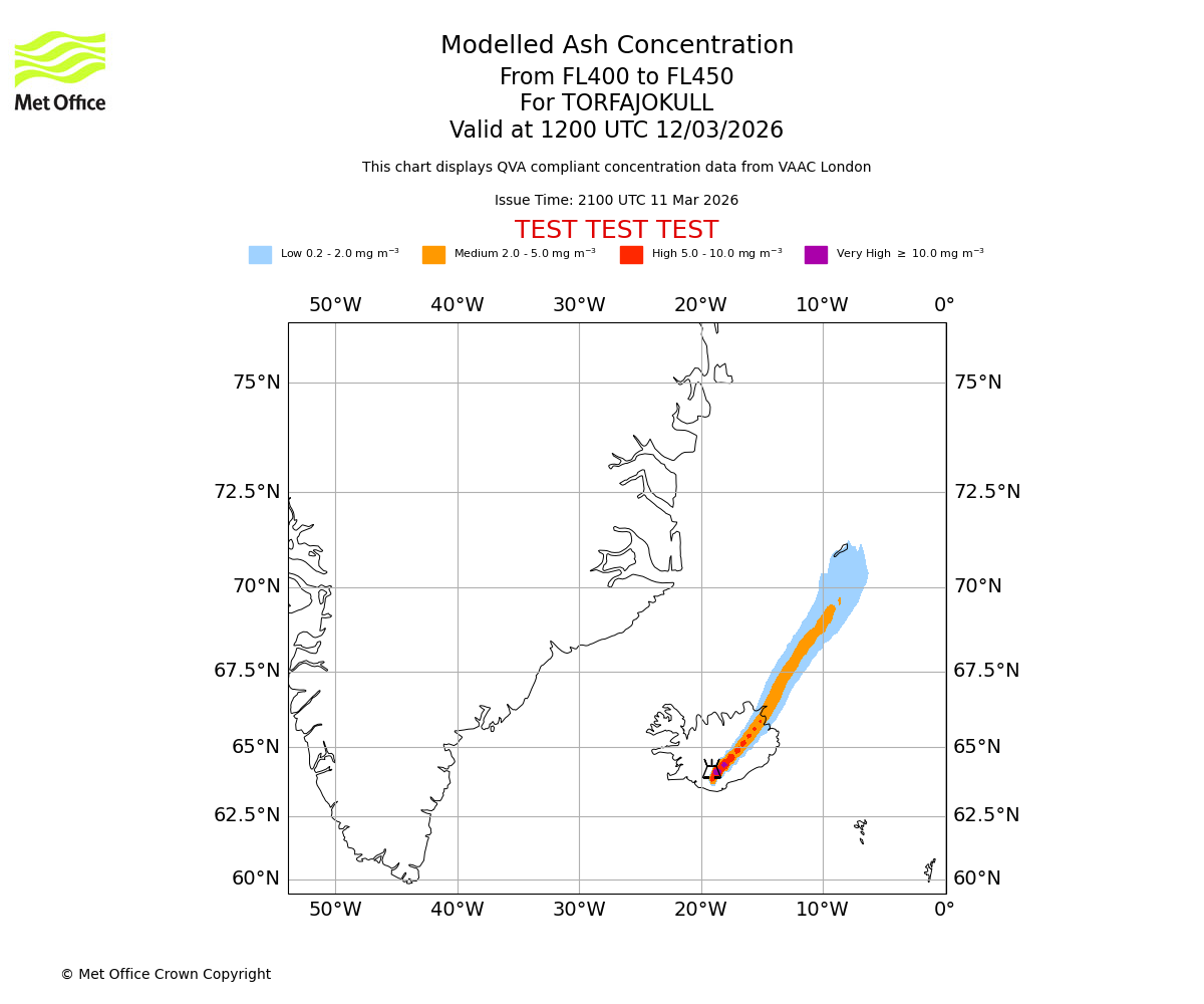 Modelled ash concentration from 350 to 400 for TORFAJOKULL. Valid at 1200 UTC 12/03/2026