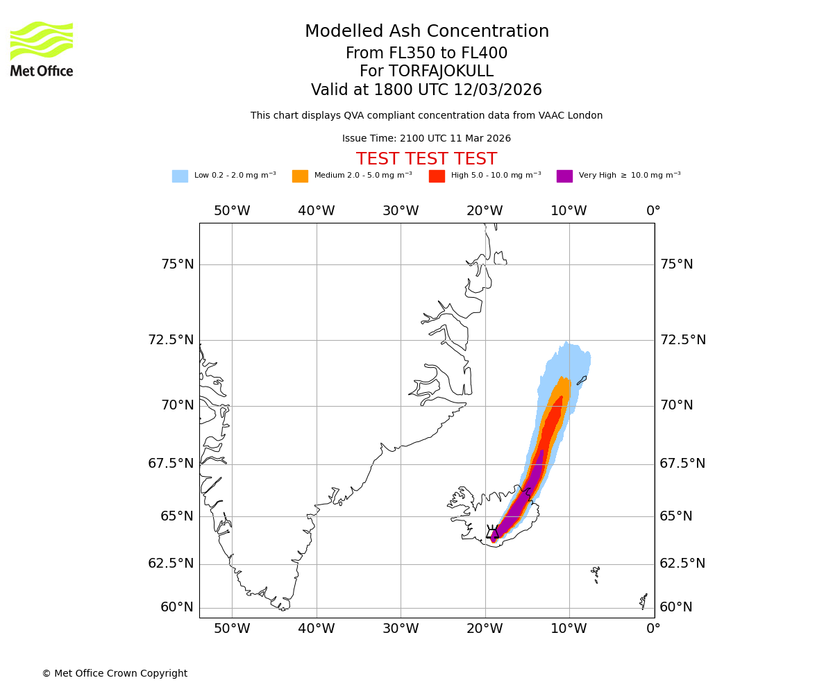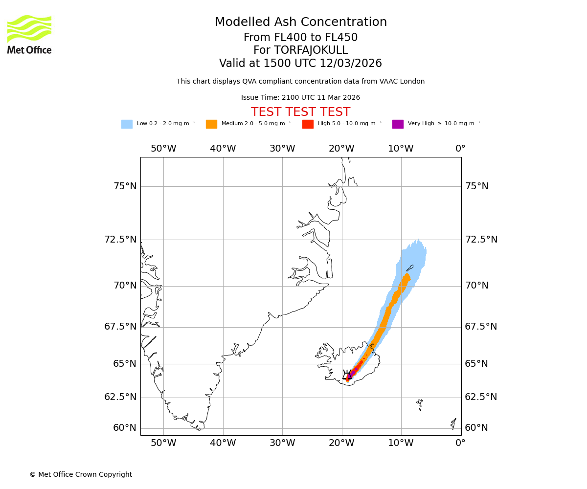 Modelled ash concentration from 350 to 400 for TORFAJOKULL. Valid at 1500 UTC 12/03/2026