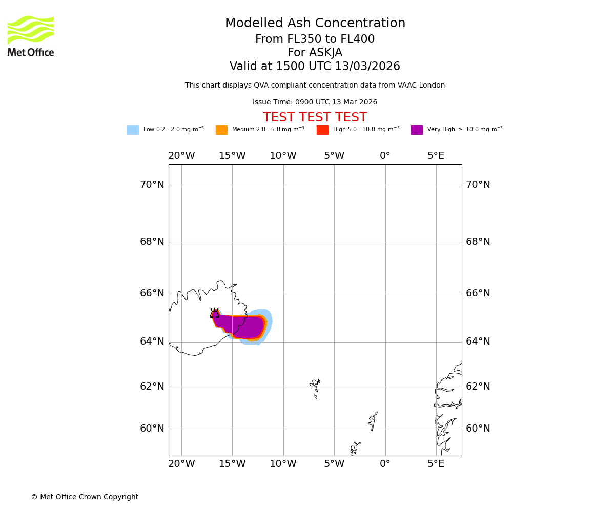 Modelled ash concentration from 350 to 400 for ASKJA. Valid at 1200 UTC 13/03/2026