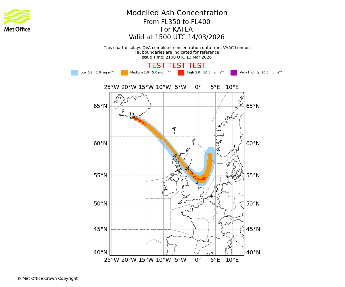 Modelled ash concentration from 350 to 400 for KATLA. Valid at 1200 UTC 14/03/2026