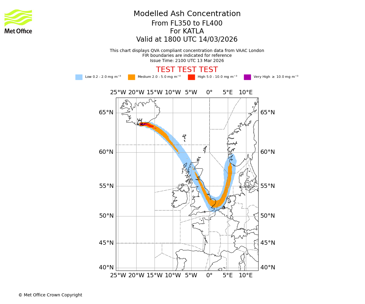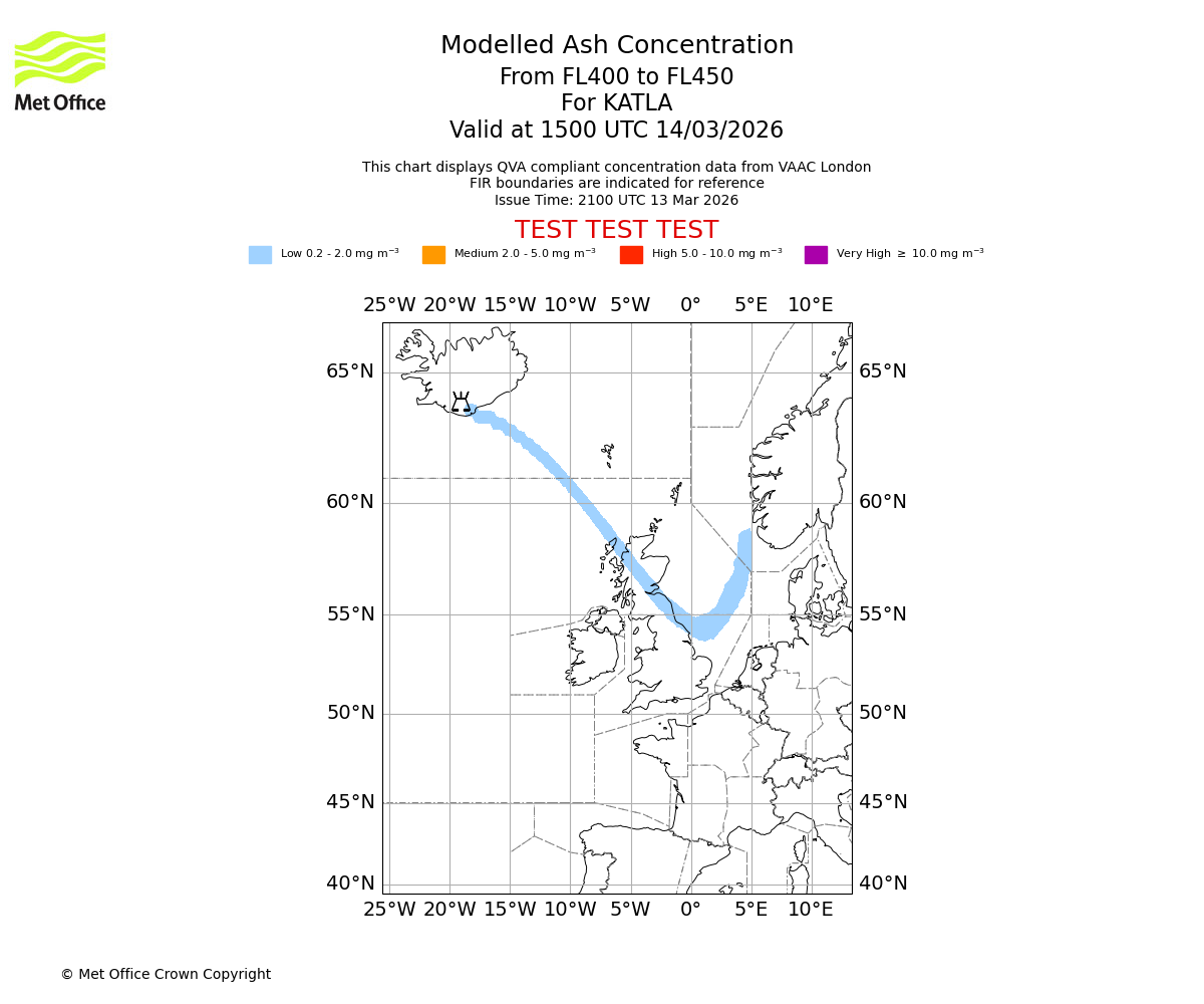 Modelled ash concentration from 350 to 400 for KATLA. Valid at 1500 UTC 14/03/2026