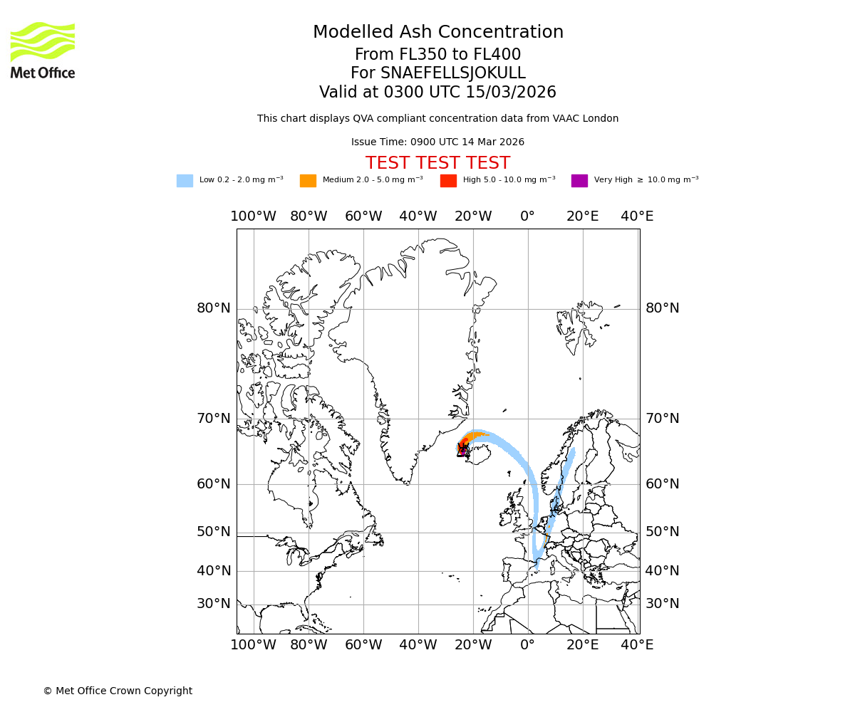 Modelled ash concentration from 350 to 400 for SNAEFELLSJOKULL. Valid at 0000 UTC 15/03/2026