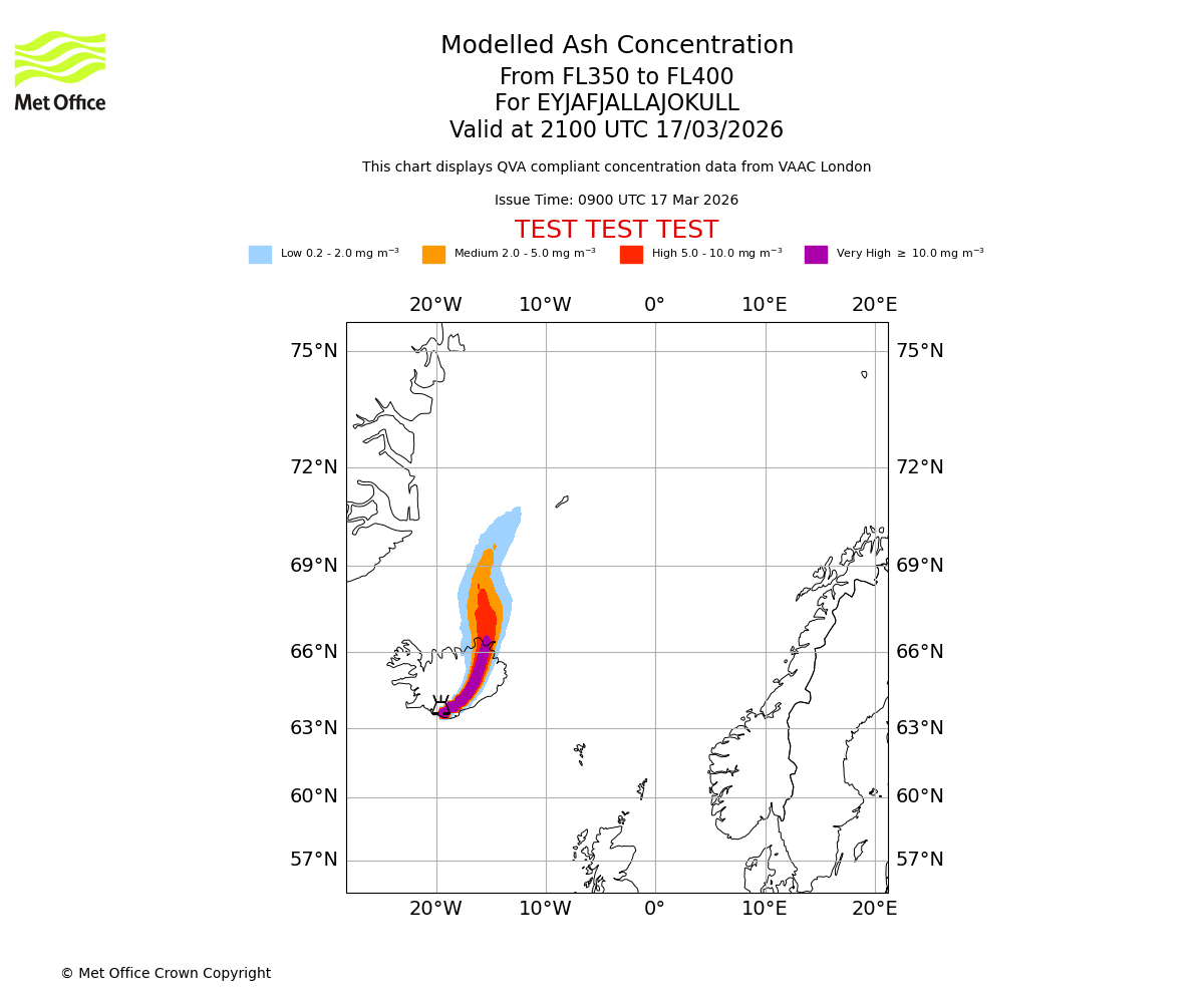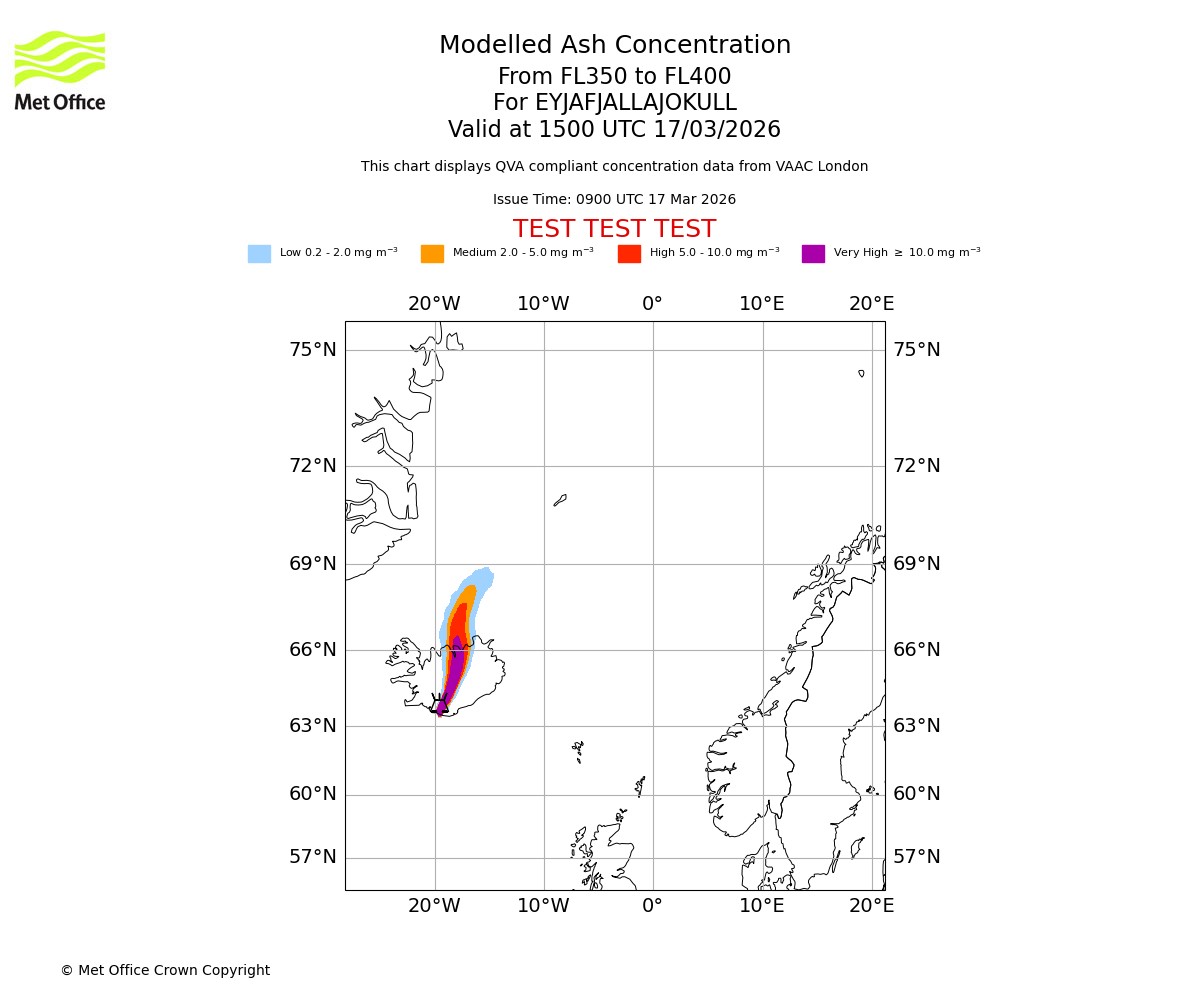 Modelled ash concentration from 350 to 400 for EYJAFJALLAJOKULL. Valid at 1800 UTC 17/03/2026