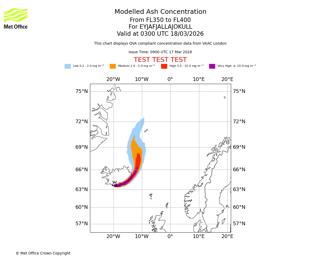 Modelled ash concentration from 350 to 400 for EYJAFJALLAJOKULL. Valid at 0000 UTC 18/03/2026