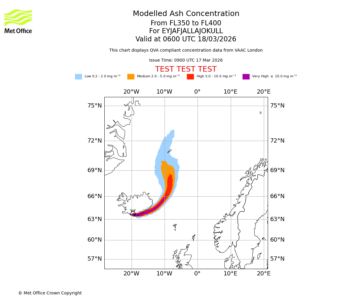Modelled ash concentration from 350 to 400 for EYJAFJALLAJOKULL. Valid at 0300 UTC 18/03/2026