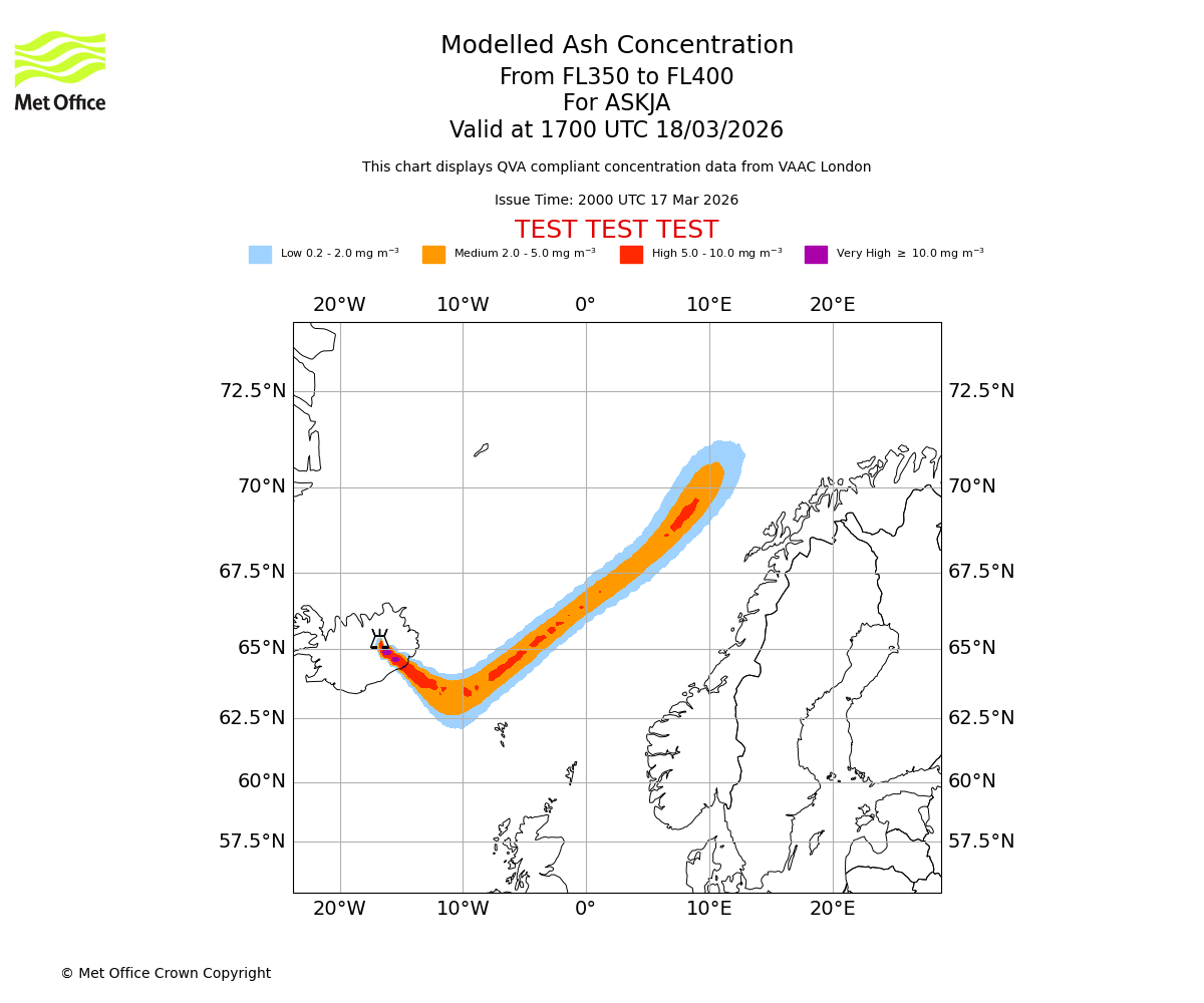 Modelled ash concentration from 350 to 400 for ASKJA. Valid at 1400 UTC 18/03/2026