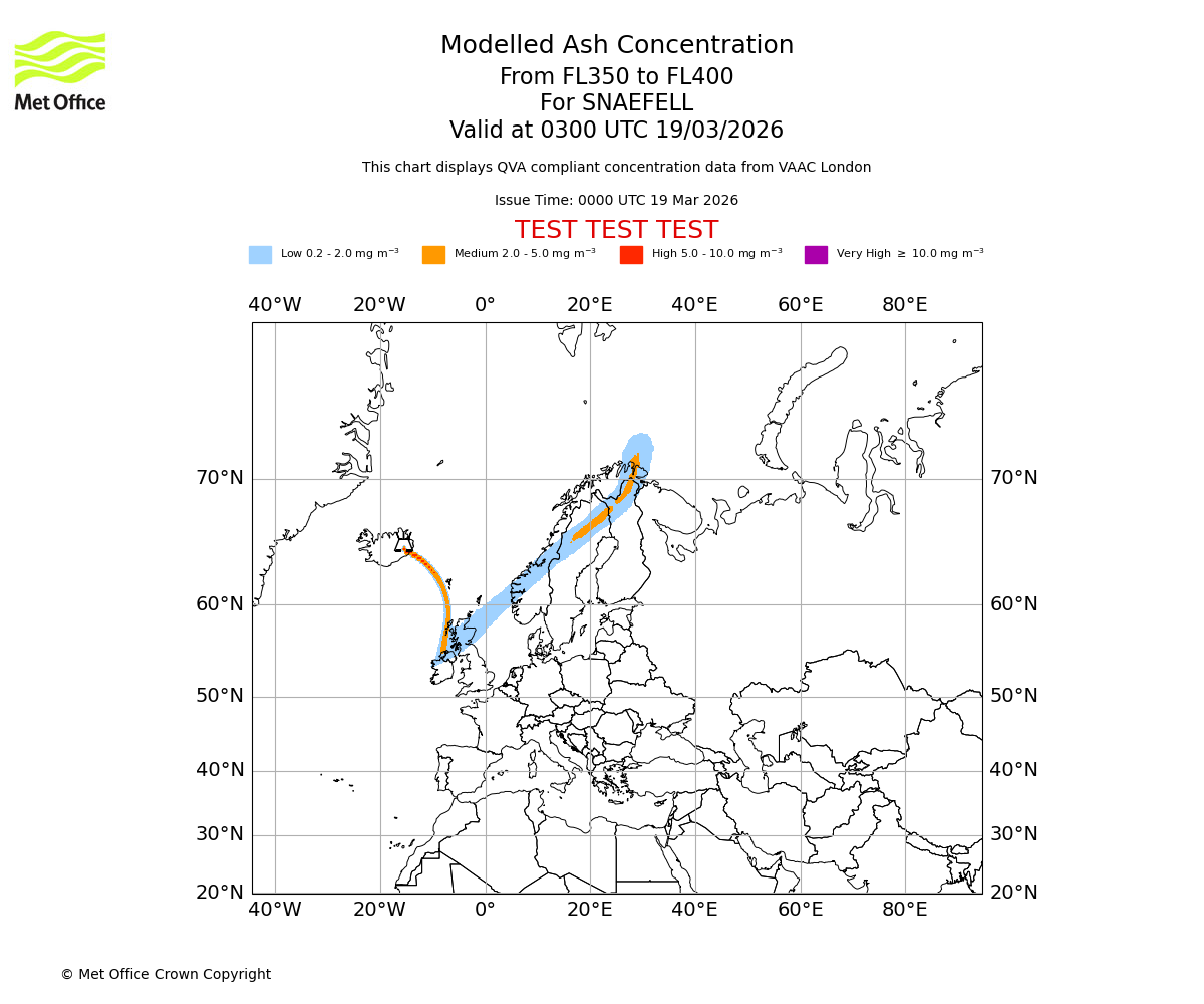 Modelled ash concentration from 350 to 400 for SNAEFELL. Valid at 0000 UTC 19/03/2026