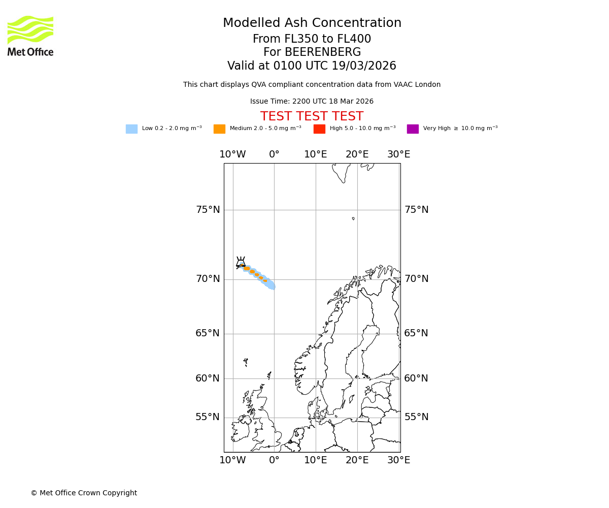 Modelled ash concentration from 350 to 400 for BEERENBERG. Valid at 2200 UTC 18/03/2026