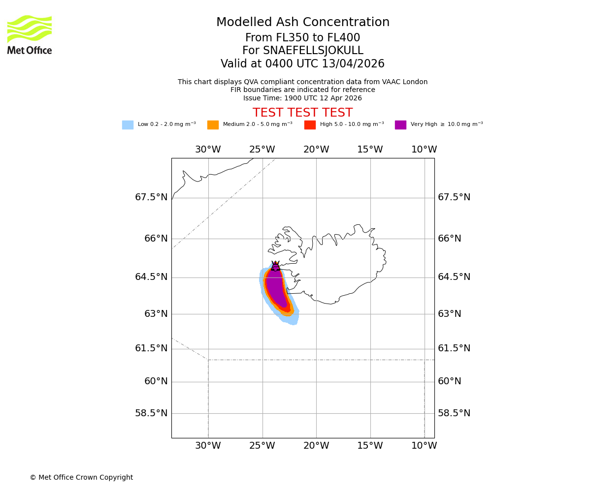 Modelled ash concentration from 350 to 400 for SNAEFELLSJOKULL. Valid at 0100 UTC 13/04/2026