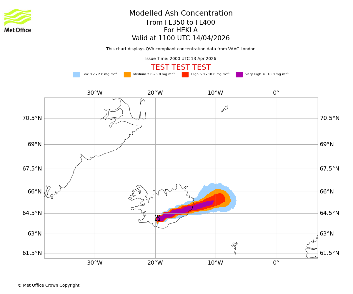 Modelled ash concentration from 350 to 400 for HEKLA. Valid at 0800 UTC 14/04/2026