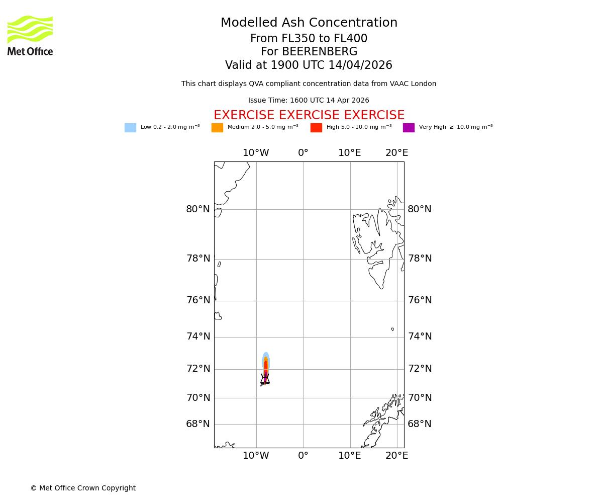 Modelled ash concentration from 350 to 400 for BEERENBERG. Valid at 1600 UTC 14/04/2026