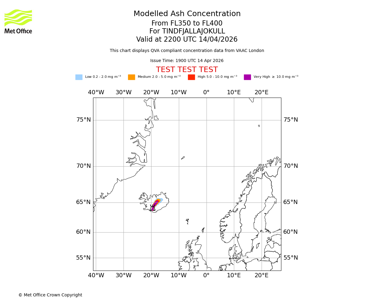 Modelled ash concentration from 350 to 400 for TINDFJALLAJOKULL. Valid at 1900 UTC 14/04/2026