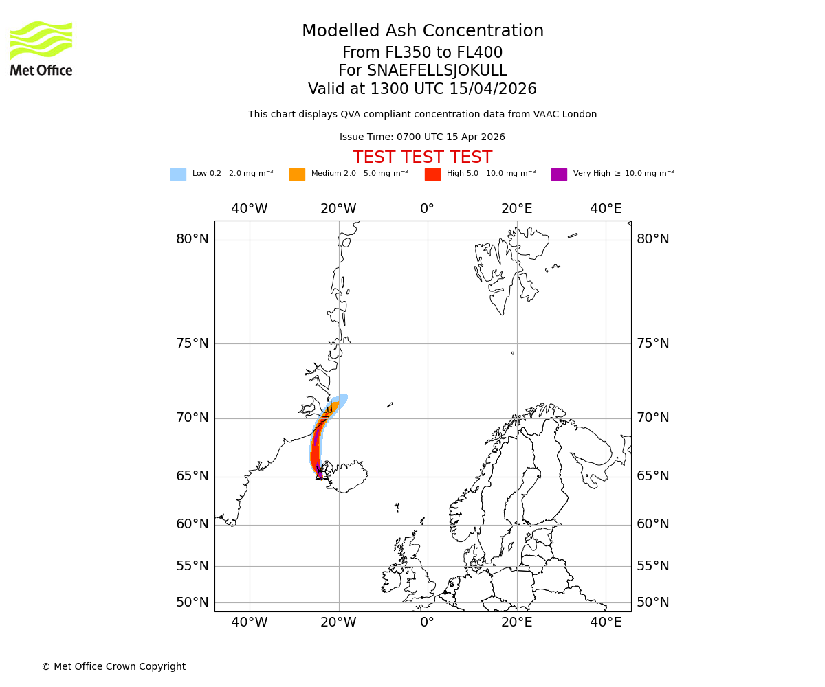 Modelled ash concentration from 350 to 400 for SNAEFELLSJOKULL. Valid at 1000 UTC 15/04/2026