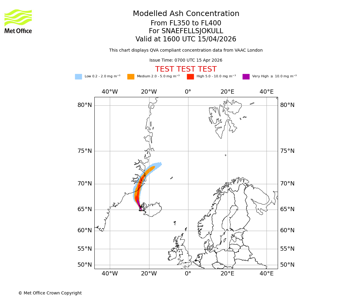 Modelled ash concentration from 350 to 400 for SNAEFELLSJOKULL. Valid at 1300 UTC 15/04/2026