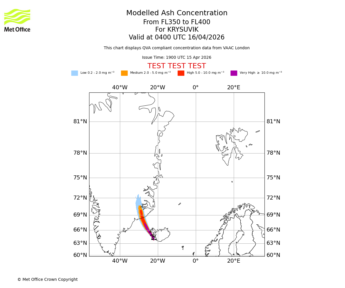 Modelled ash concentration from 350 to 400 for KRYSUVIK. Valid at 0100 UTC 16/04/2026