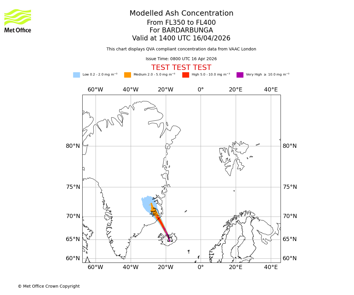 Modelled ash concentration from 350 to 400 for BARDARBUNGA. Valid at 1100 UTC 16/04/2026