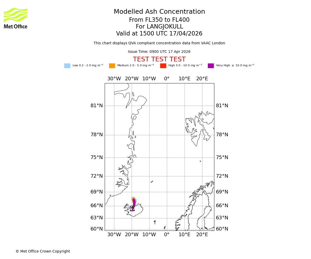 Modelled ash concentration from 350 to 400 for LANGJOKULL. Valid at 1200 UTC 17/04/2026