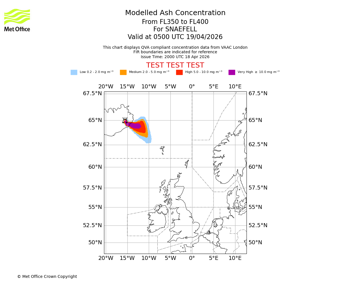 Modelled ash concentration from 350 to 400 for SNAEFELL. Valid at 0200 UTC 19/04/2026