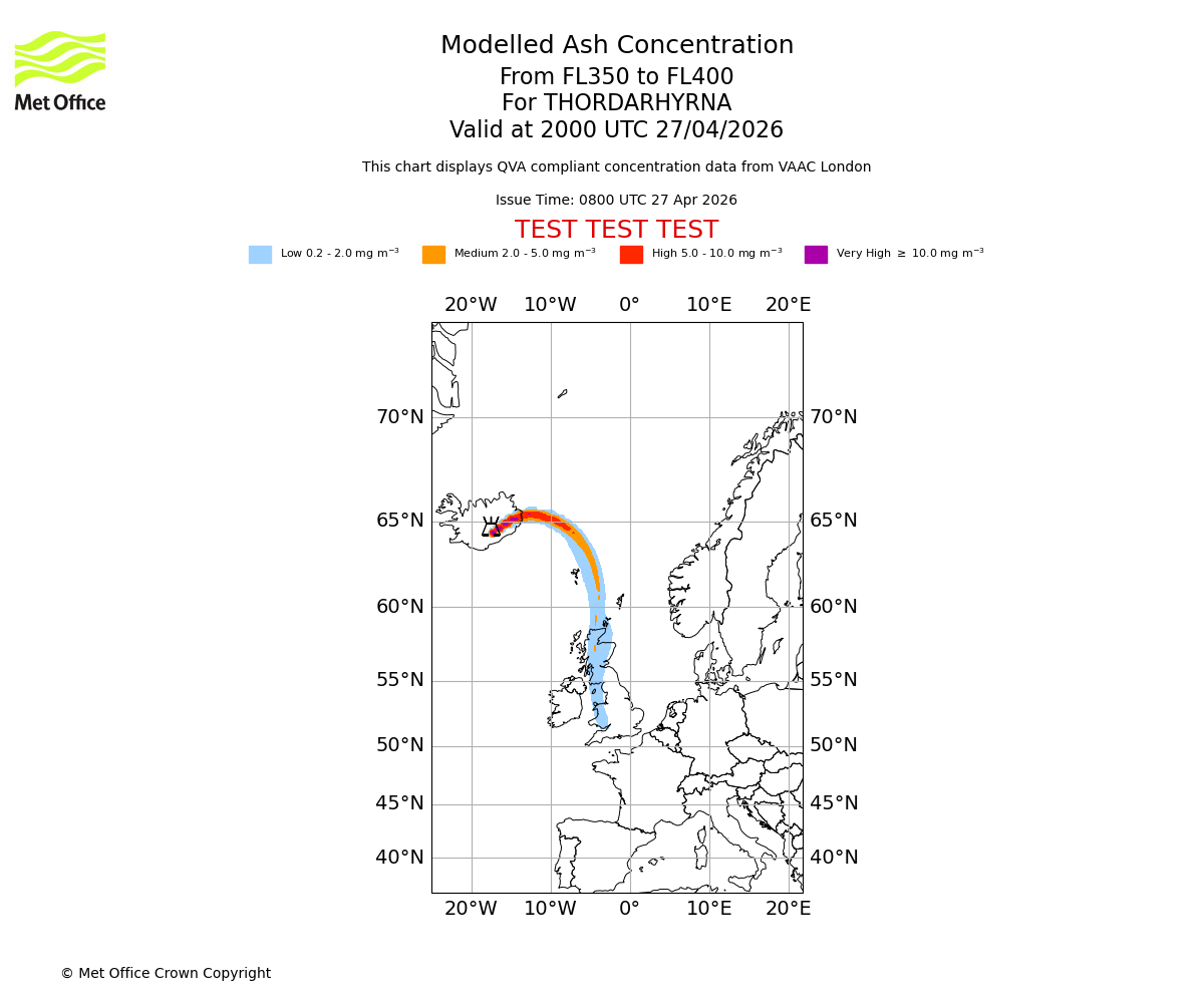 Modelled ash concentration from 350 to 400 for THORDARHYRNA. Valid at 1700 UTC 27/04/2026