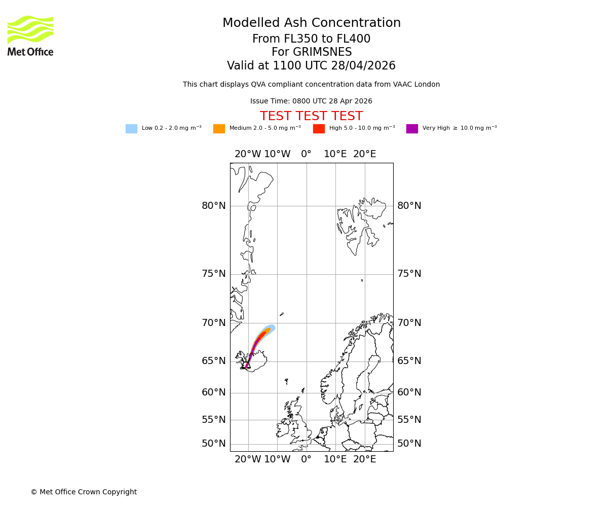 Modelled ash concentration from 350 to 400 for GRIMSNES. Valid at 0800 UTC 28/04/2026
