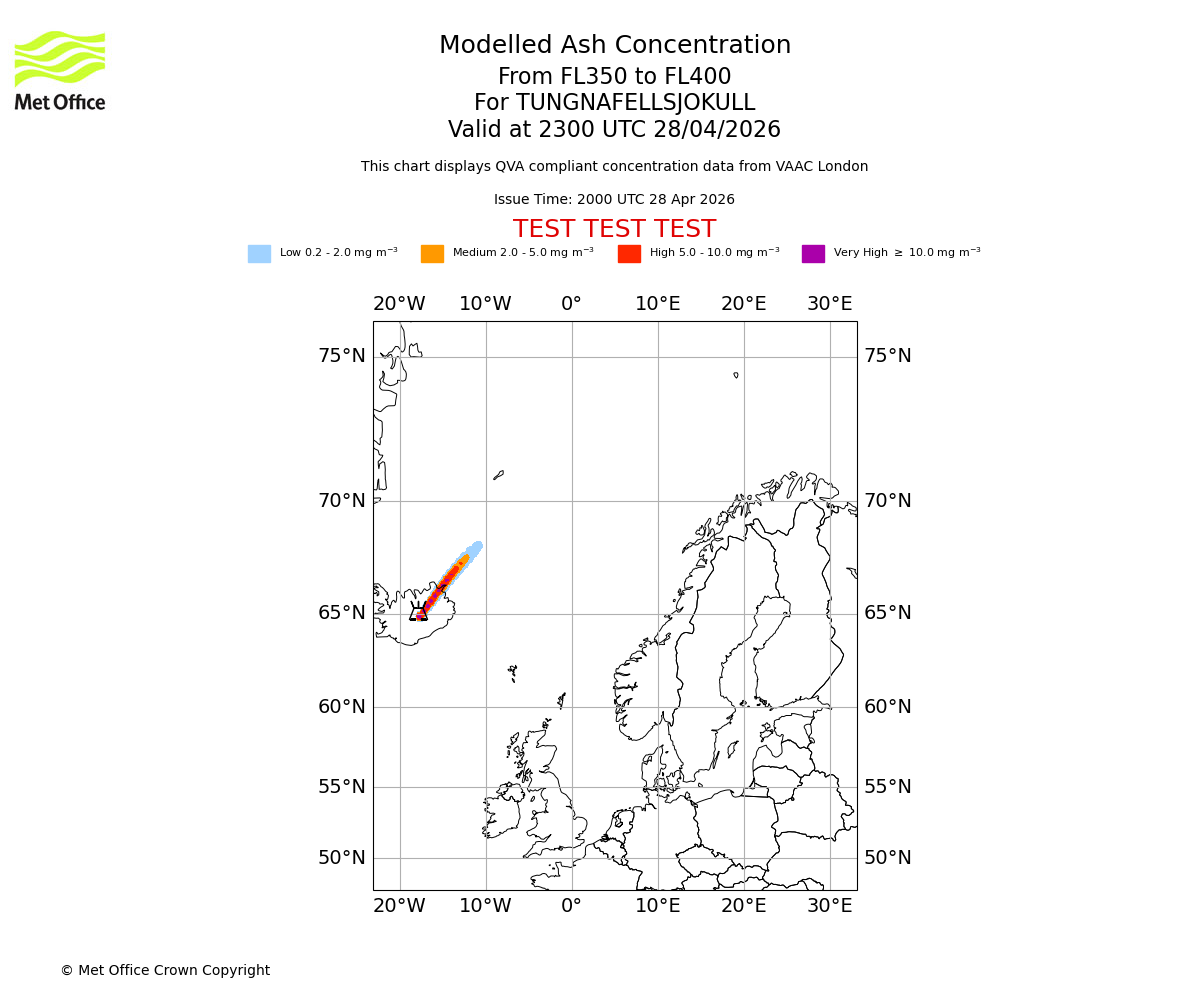 Modelled ash concentration from 350 to 400 for TUNGNAFELLSJOKULL. Valid at 2000 UTC 28/04/2026