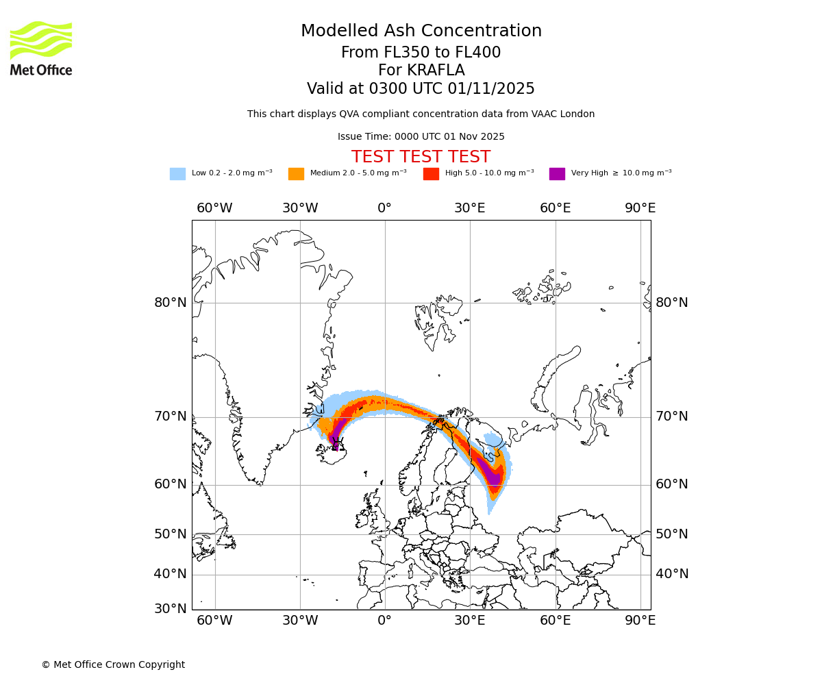 In accordance with ICAO Annex 3, Amendment 82 VAAC London will provide operational QVA forecasts from 27 November 2025 and these will be made available via a VAAC London QVA API information service. These charts are currently provided for test and evaluation purposes (not for operational use) until the introduction of the operational service.