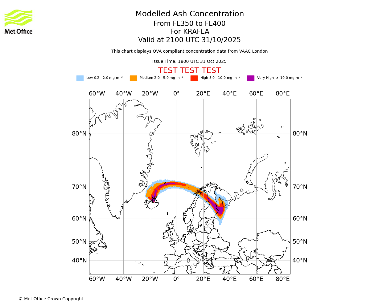 Modelled ash concentration from 350 to 400 for KRAFLA. Valid at 1800 UTC 31/10/2025