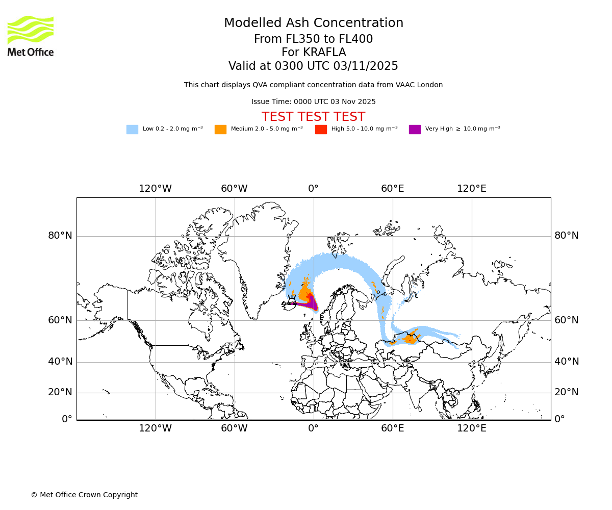 Modelled ash concentration from 350 to 400 for KRAFLA. Valid at 0000 UTC 03/11/2025