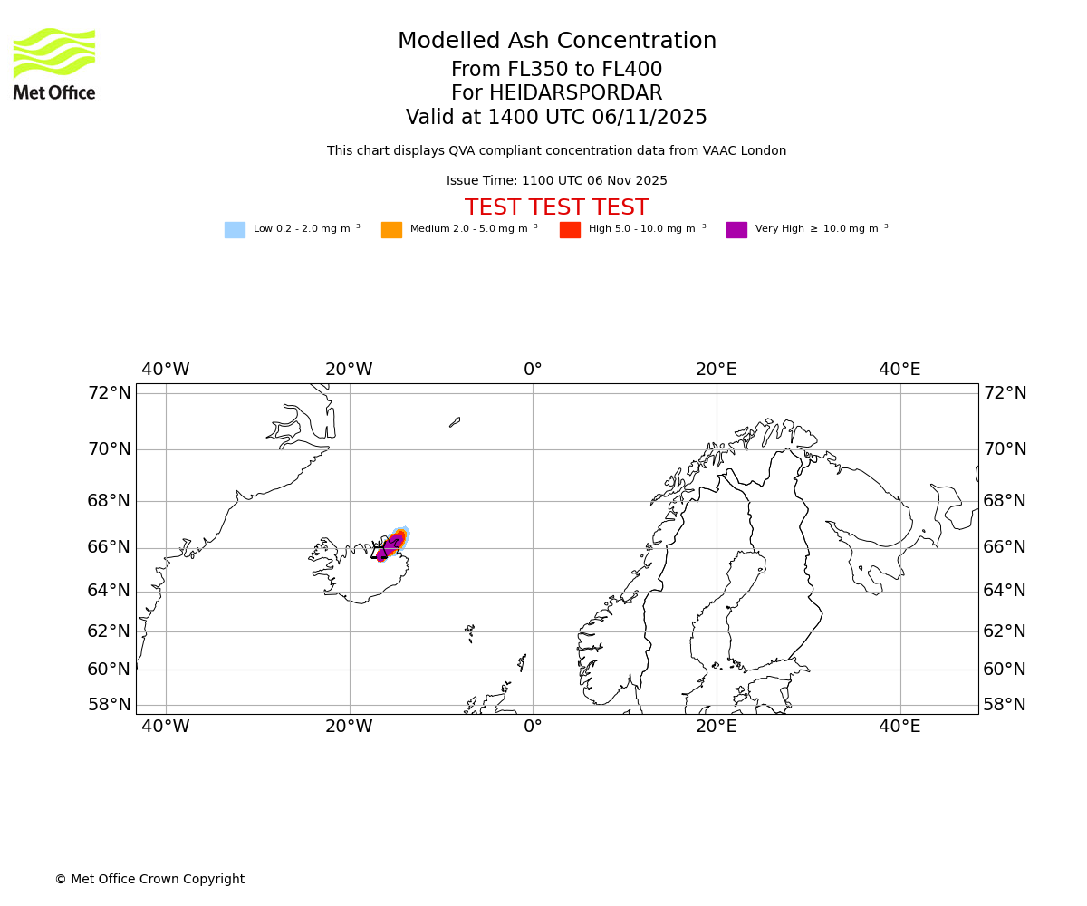 Modelled ash concentration from 350 to 400 for HEIDARSPORDAR. Valid at 1100 UTC 06/11/2025