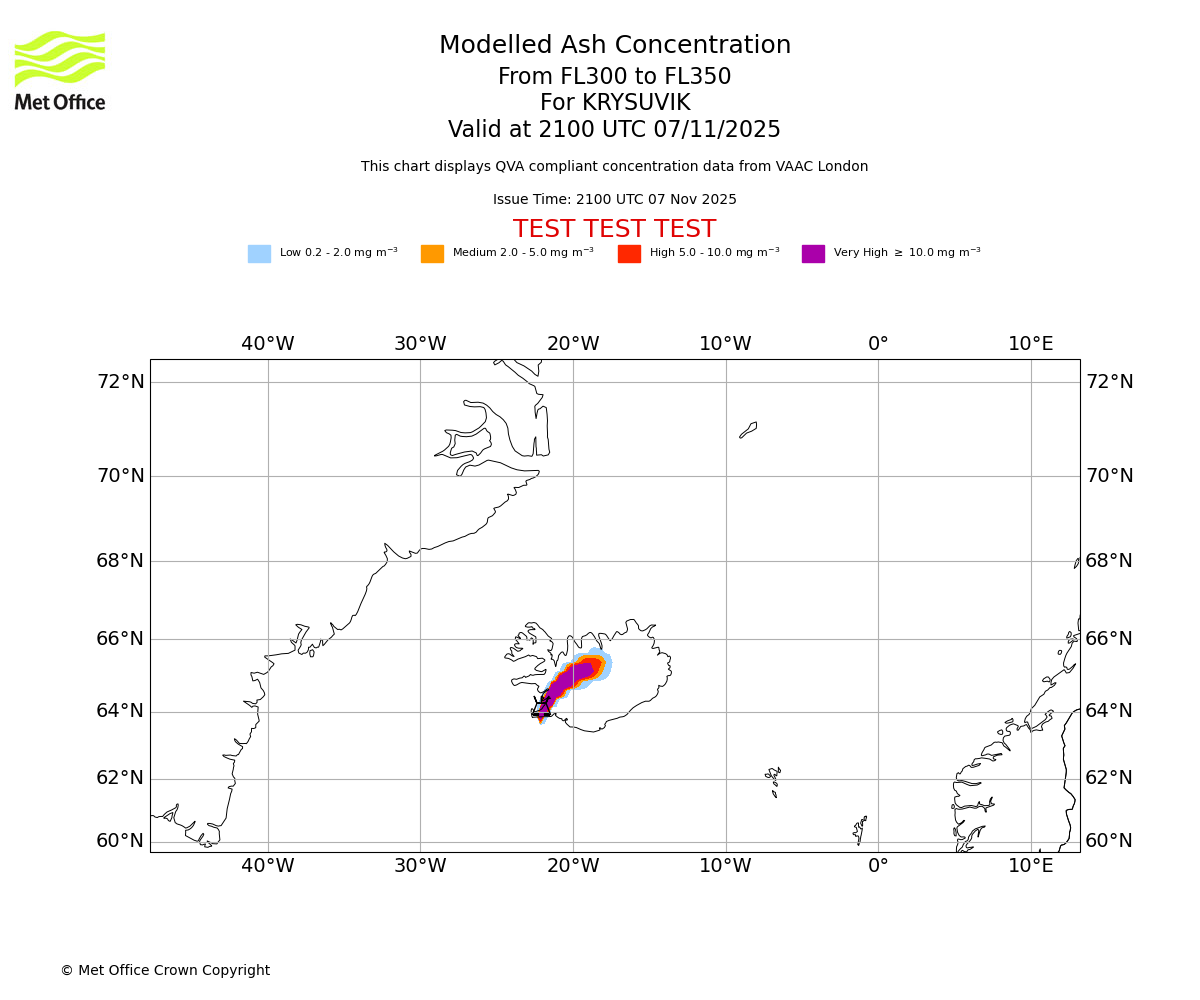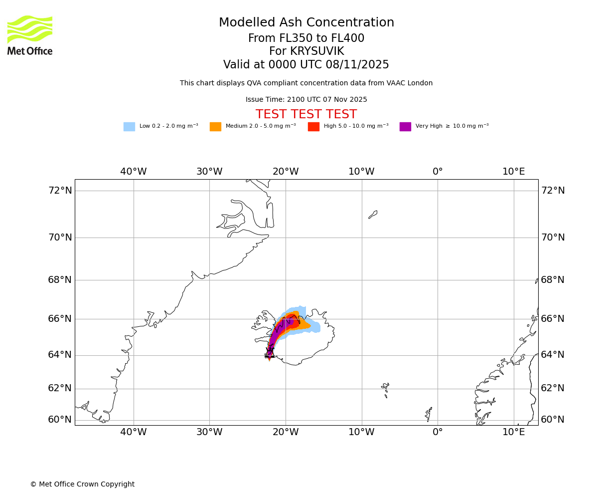 Modelled ash concentration from 350 to 400 for KRYSUVIK. Valid at 2100 UTC 07/11/2025