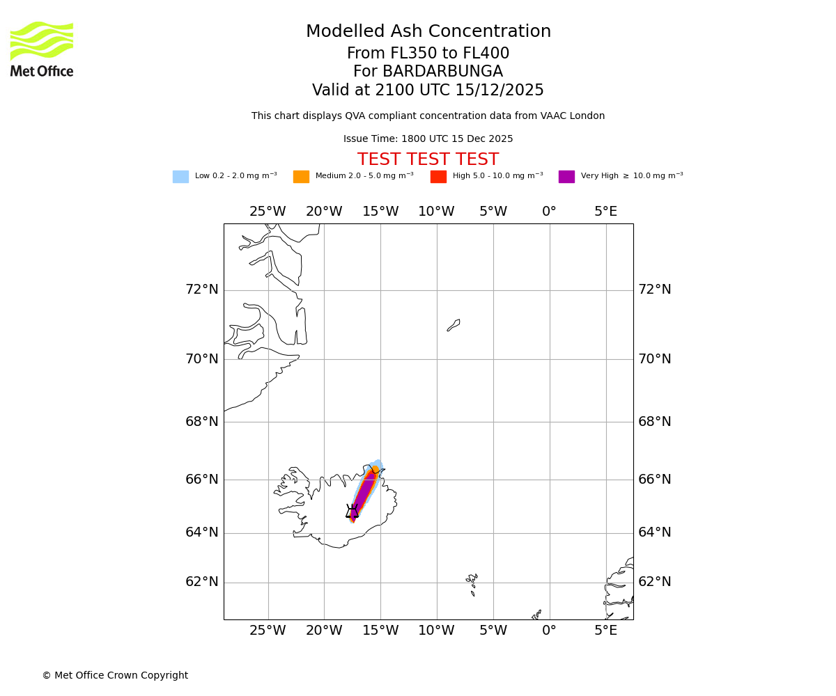 Modelled ash concentration from 350 to 400 for BARDARBUNGA. Valid at 1800 UTC 15/12/2025