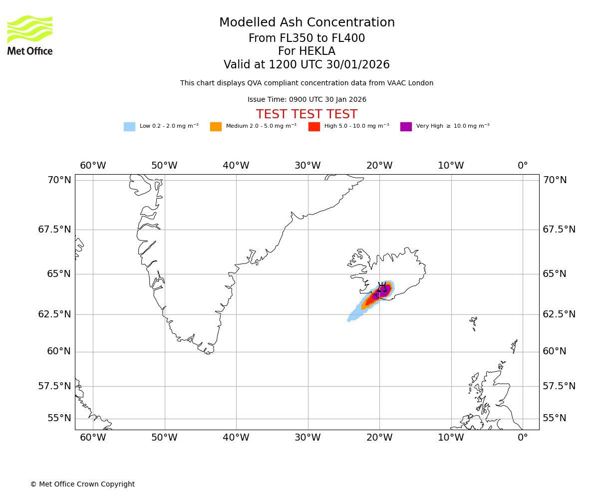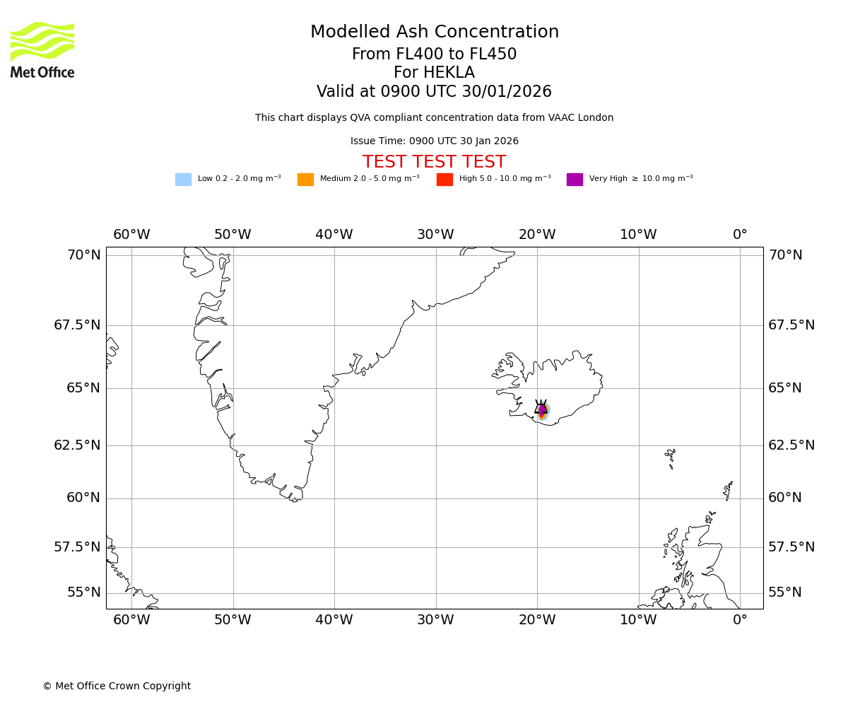 Modelled ash concentration from 350 to 400 for HEKLA. Valid at 0900 UTC 30/01/2026