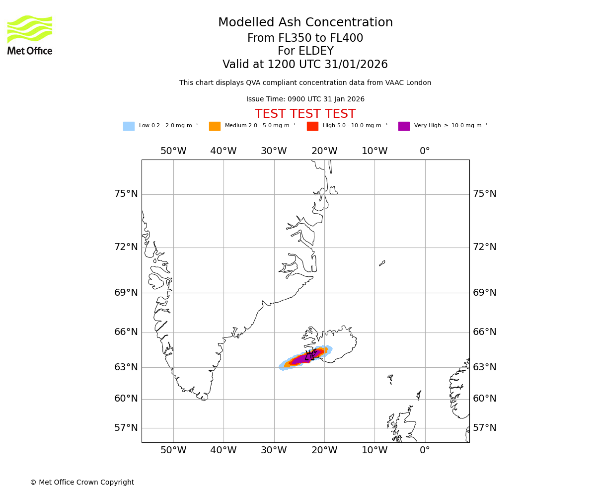 Modelled ash concentration from 350 to 400 for ELDEY. Valid at 0900 UTC 31/01/2026