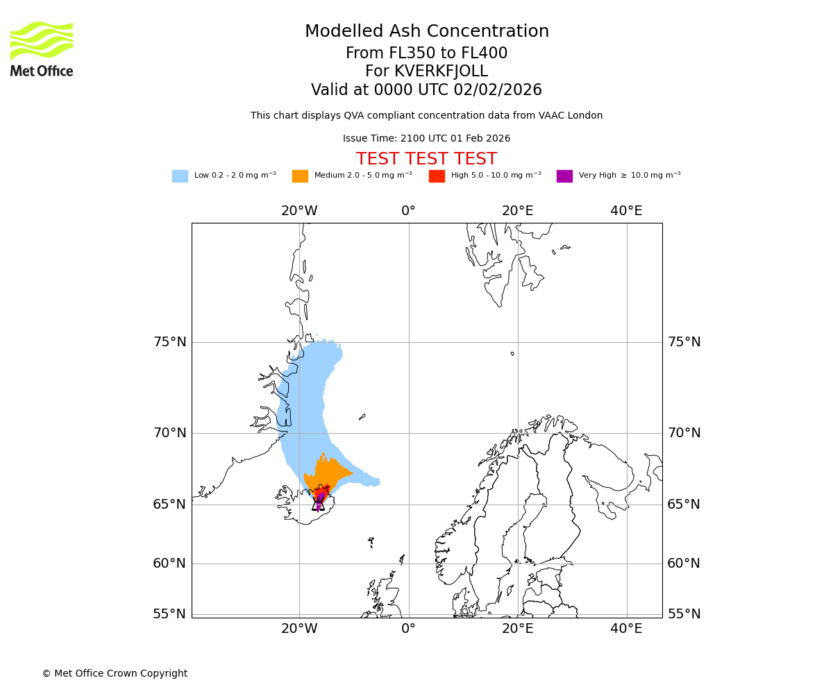 Modelled ash concentration from 350 to 400 for KVERKFJOLL. Valid at 2100 UTC 01/02/2026
