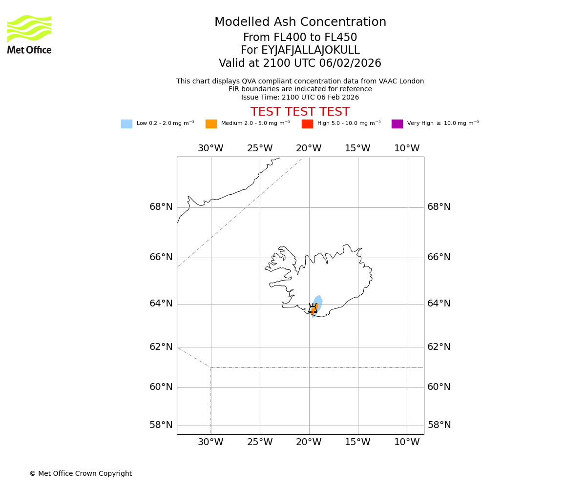 Modelled ash concentration from 350 to 400 for EYJAFJALLAJOKULL. Valid at 2100 UTC 06/02/2026
