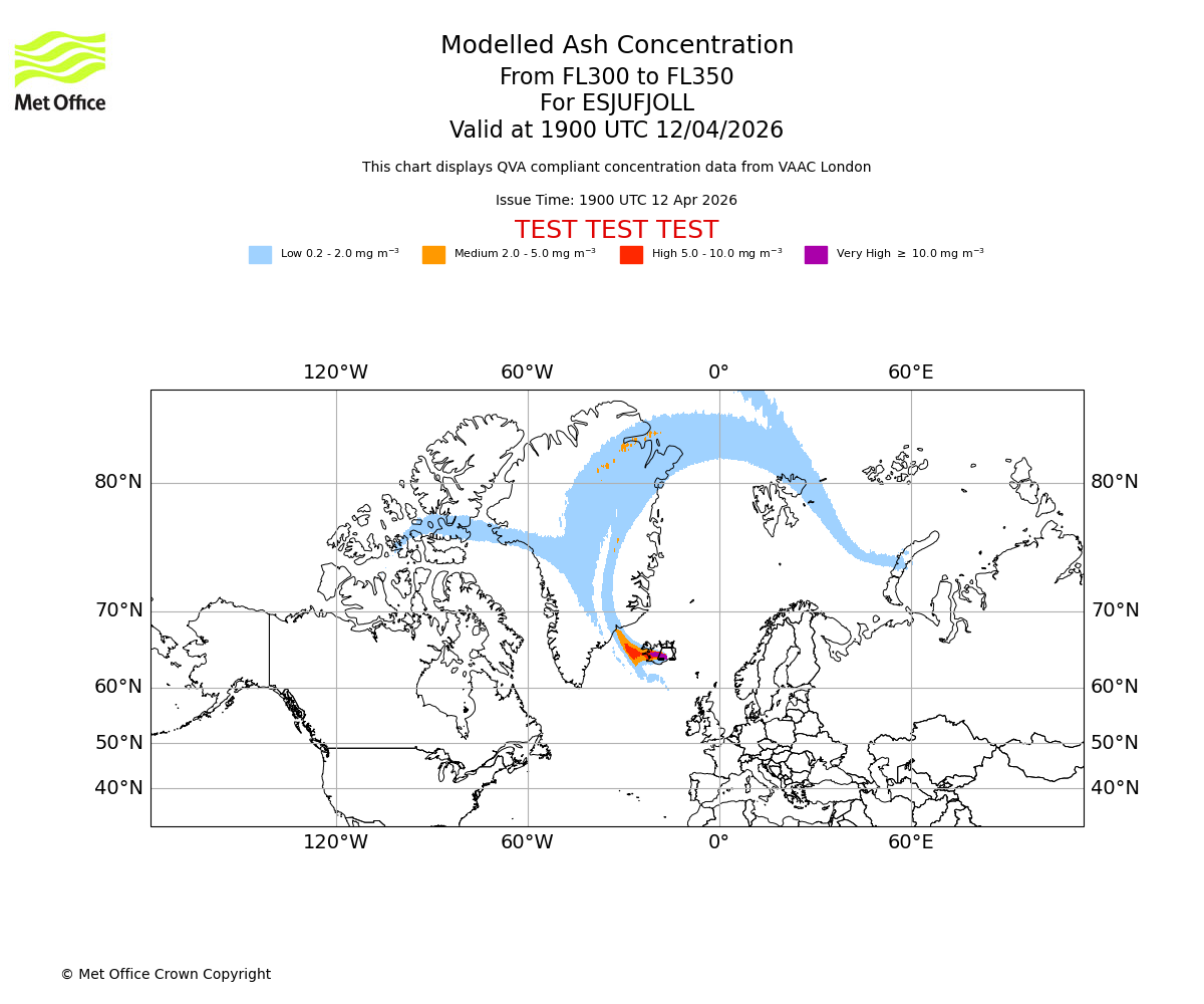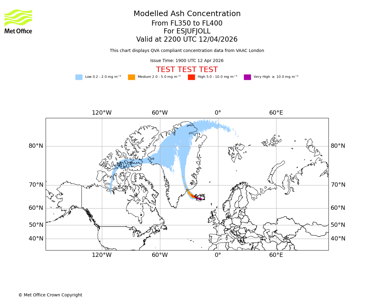 Modelled ash concentration from 350 to 400 for ESJUFJOLL. Valid at 1900 UTC 12/04/2026
