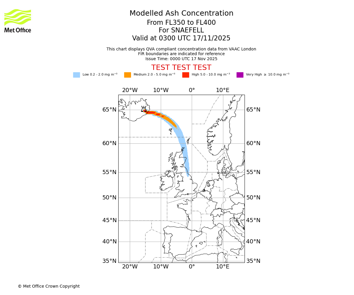 Modelled ash concentration from 350 to 400 for SNAEFELL. Valid at 0000 UTC 17/11/2025