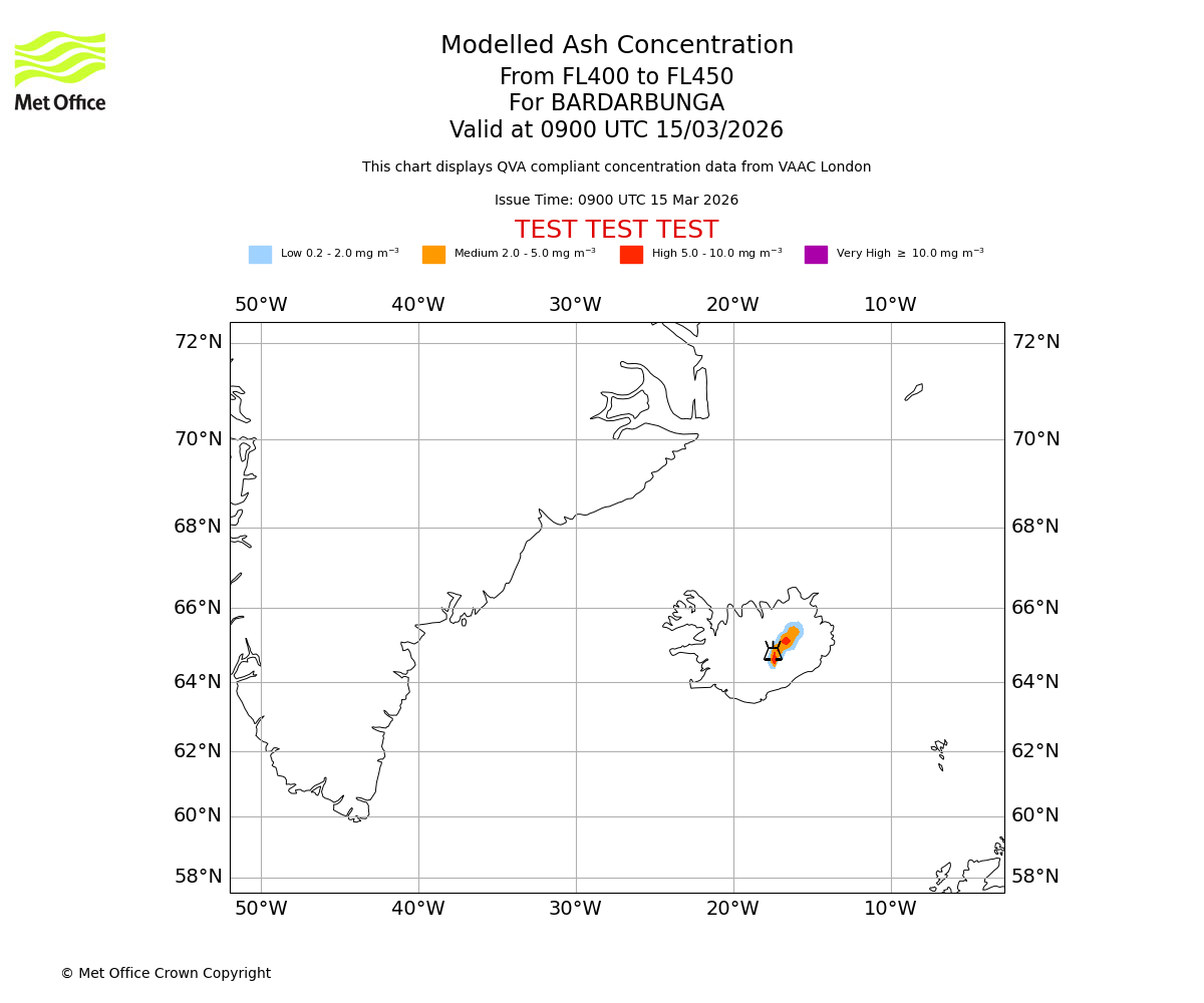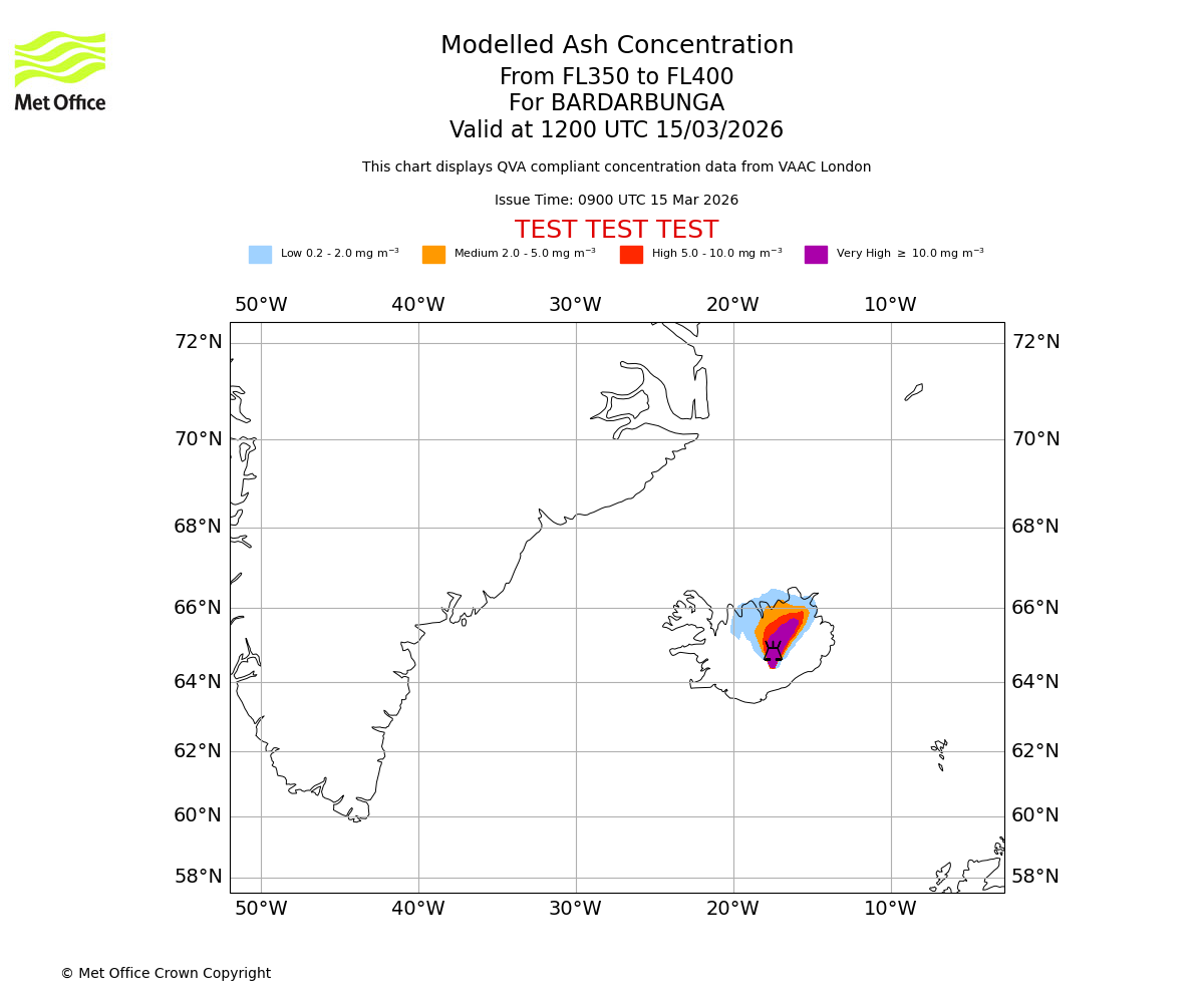 Modelled ash concentration from 350 to 400 for BARDARBUNGA. Valid at 0900 UTC 15/03/2026