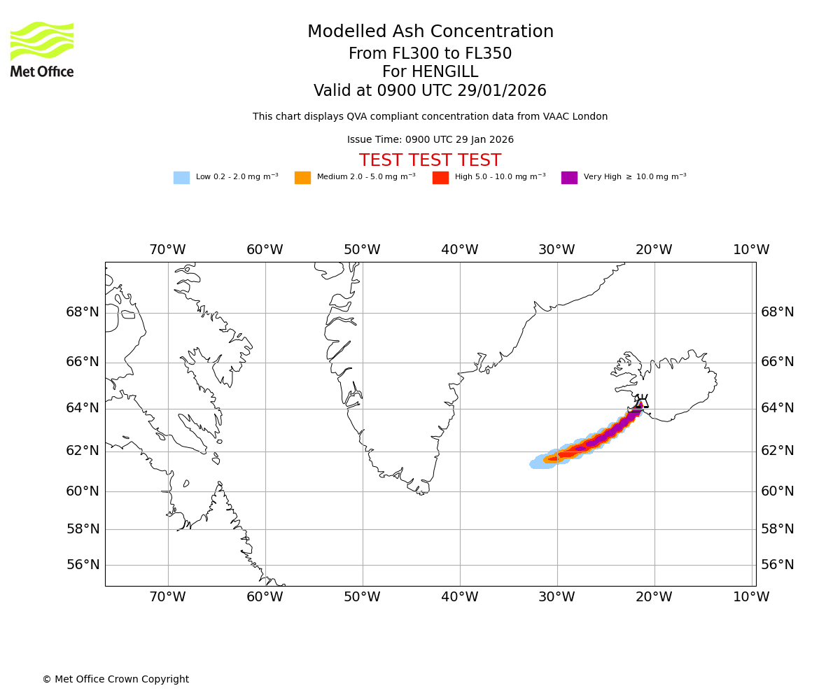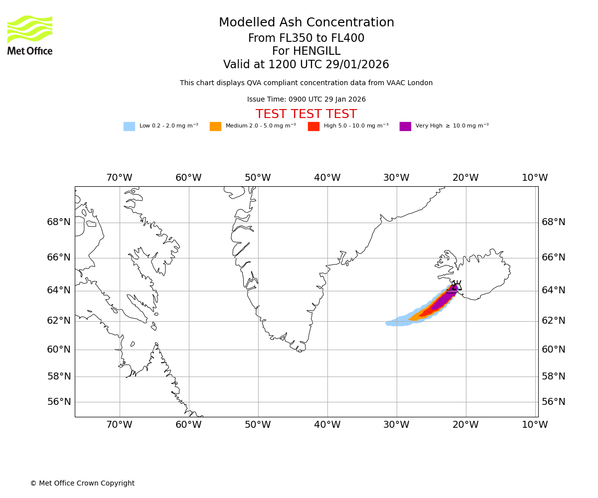 Modelled ash concentration from 350 to 400 for HENGILL. Valid at 0900 UTC 29/01/2026