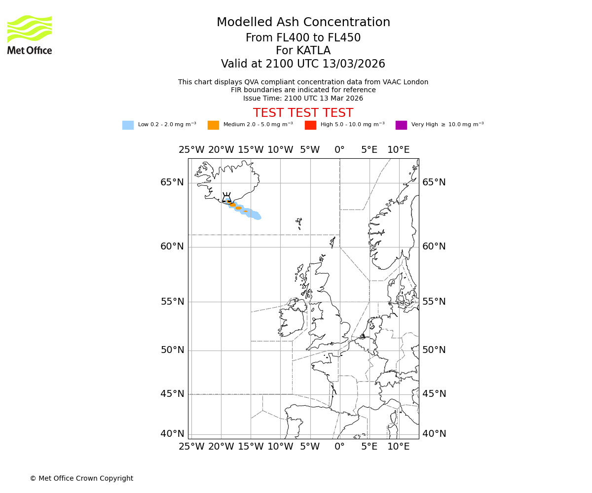 Modelled ash concentration from 350 to 400 for KATLA. Valid at 2100 UTC 13/03/2026